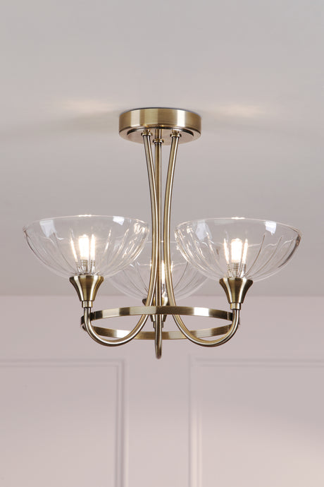 Laura Ashley Wellham 3 Light Semi-Flush Antique Brass and Ribbed Glass