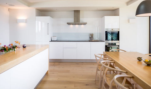 By way of replicating daylight, the main living space in the home included concealed indirect LED tape light, casting light off the ceiling.