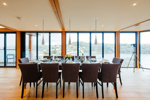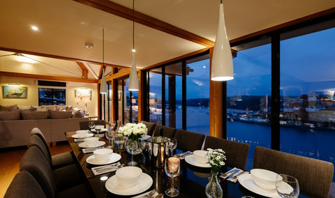 Simple pendant lights were installed over both the kitchen island and dining table for entertaining, whilst at the same time, not obscuring the stunning river views.