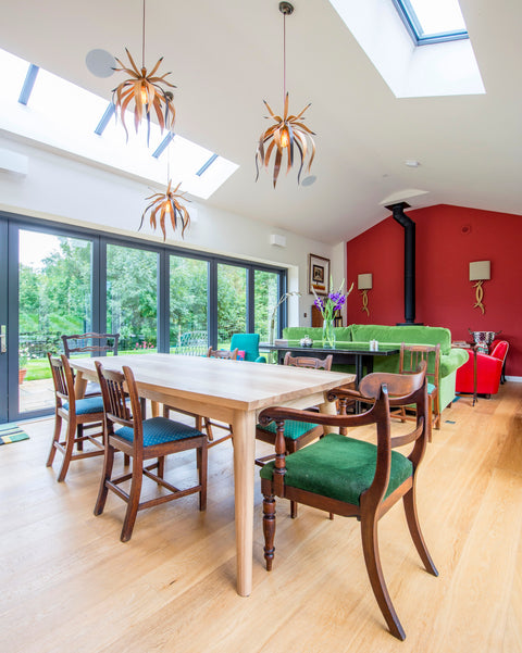 From adding drama to a cloakroom covered in vibrant ‘chicken’ wallpaper to effectively lighting what risked being gloomy subterranean bathrooms, our warm relationship with the clients has resulted in a lighting scheme that very much enhances their naturally joyful creativity.