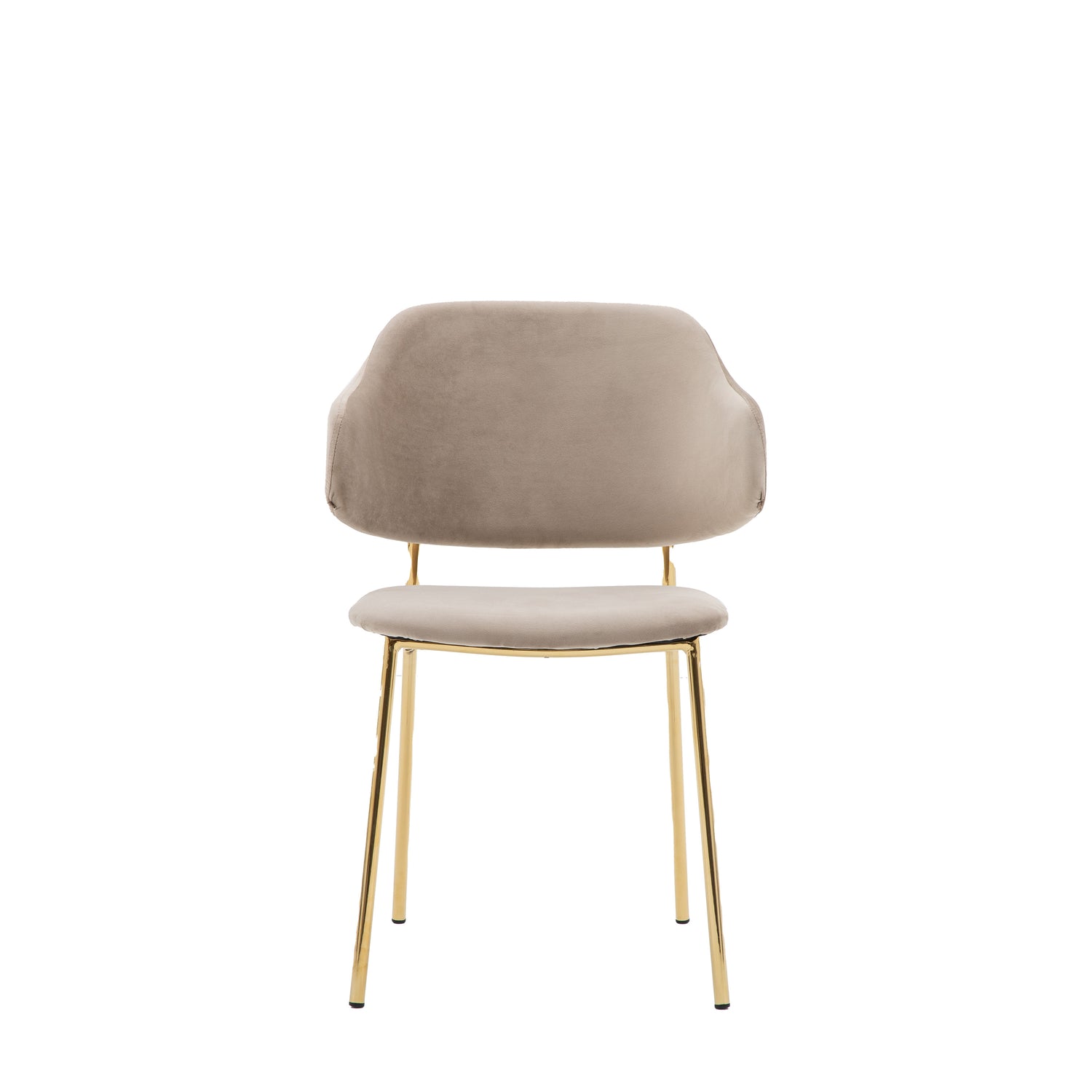 Add a little luxury to your dining space or office. This set of 2 chairs offers contemporary modern design with a hint of old fashion glamour. Upholstered in soft taupe velvet, the chairs feature a unique split design and slim golden metal legs.