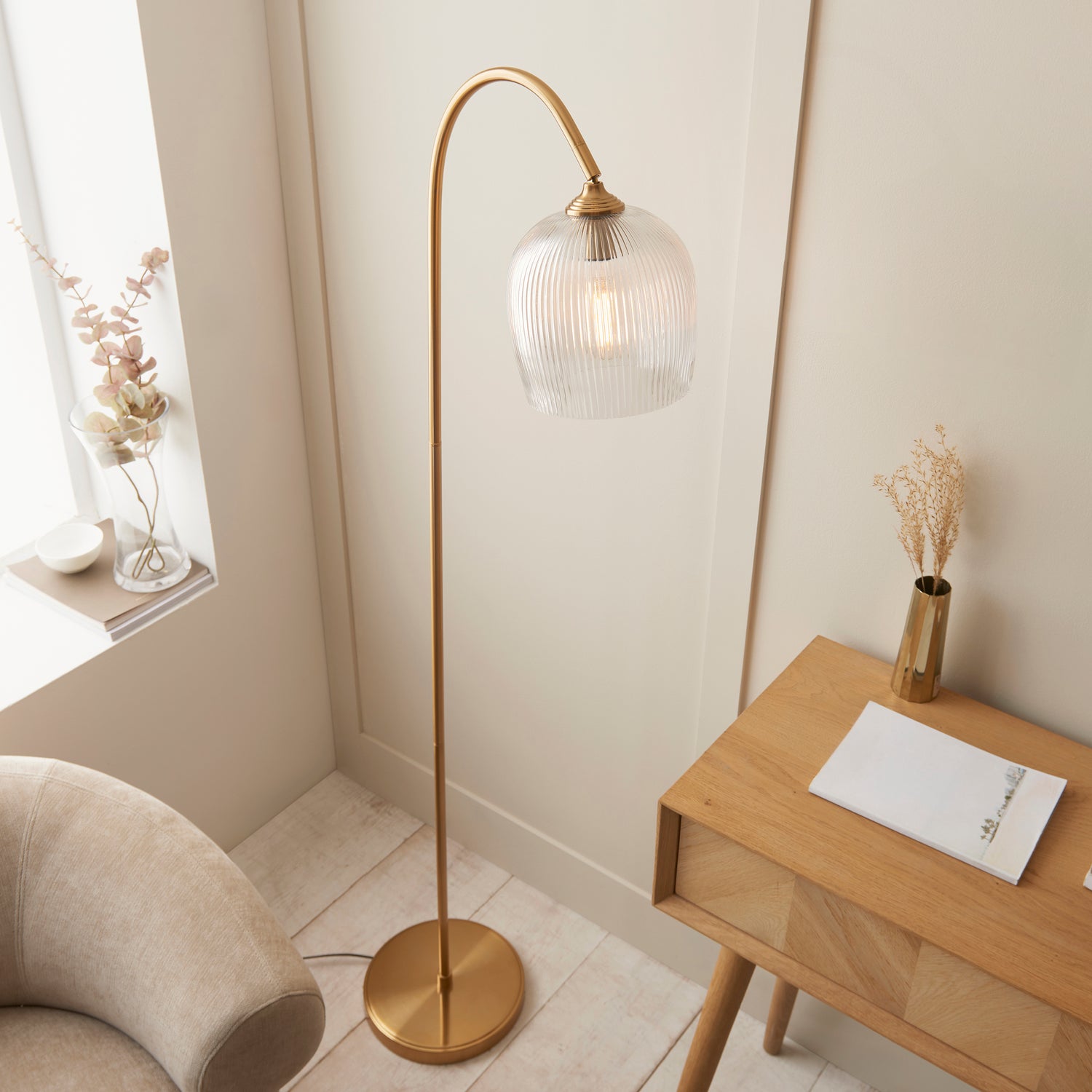 Bring timeless illuminated elegance to any space with this clean line floor lamp, featuring an adjustable head. The gracefully curved stem in a warm brass metal finish is complemented by a ribbed domed glass shade, offering both style and function. Ideal for reading nooks, lounge areas, or bedrooms, its adjustable design allows you to direct light exactly where it's needed.
