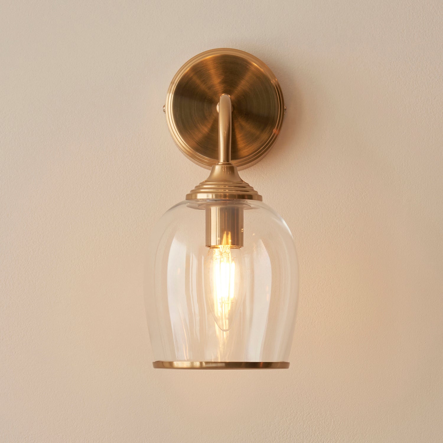 Graceful and understated, this single wall light pairs a clear domed glass shade with a refined metal edge for a look that’s both timeless and contemporary. The gently curved arm and round back plate in a warm brass-tone finish echo classic detailing while letting the glass take centre stage. Perfect beside a mirror, in a hallway, or framing a bed, it showcases decorative bulbs beautifully and adds a welcoming glow without overpowering surrounding décor.