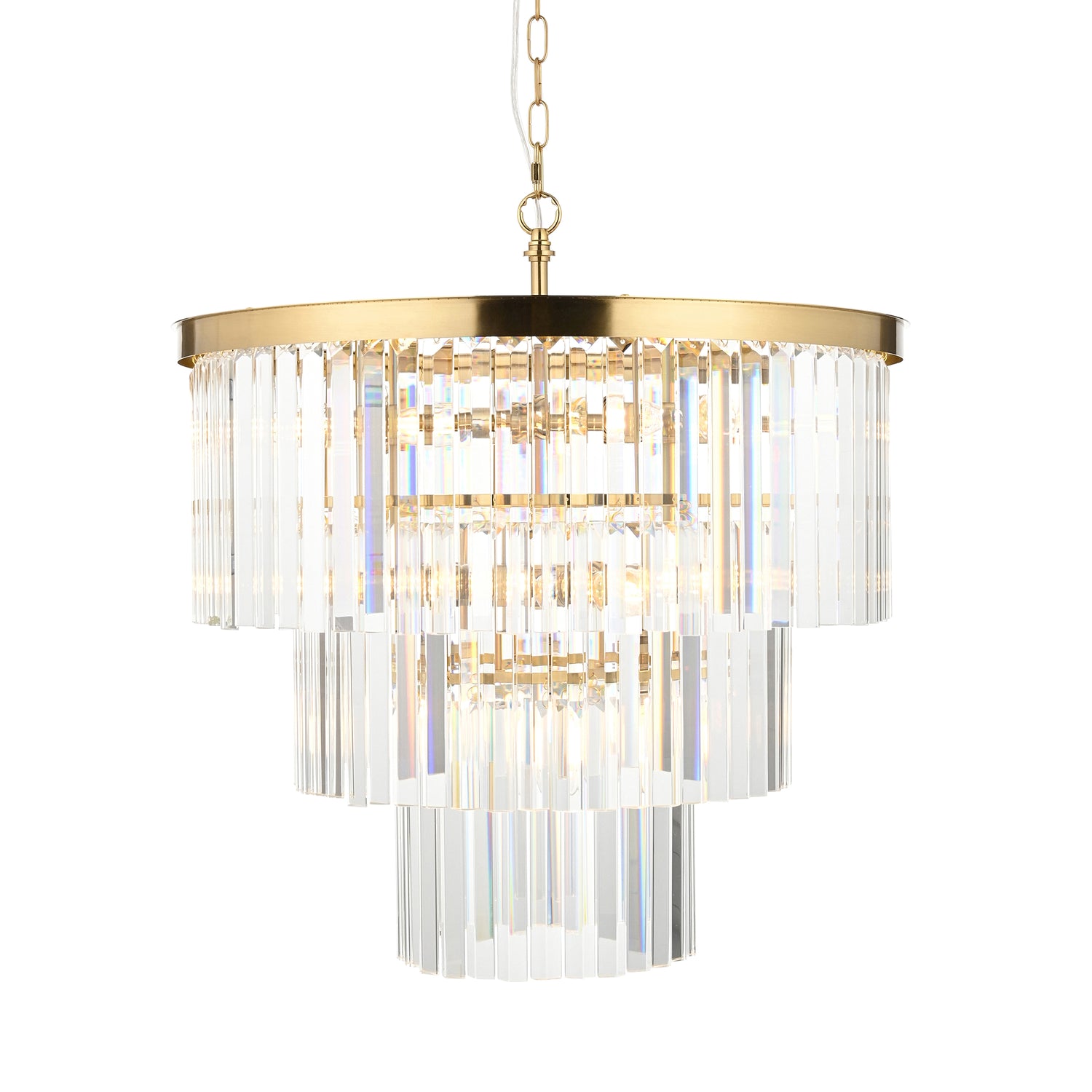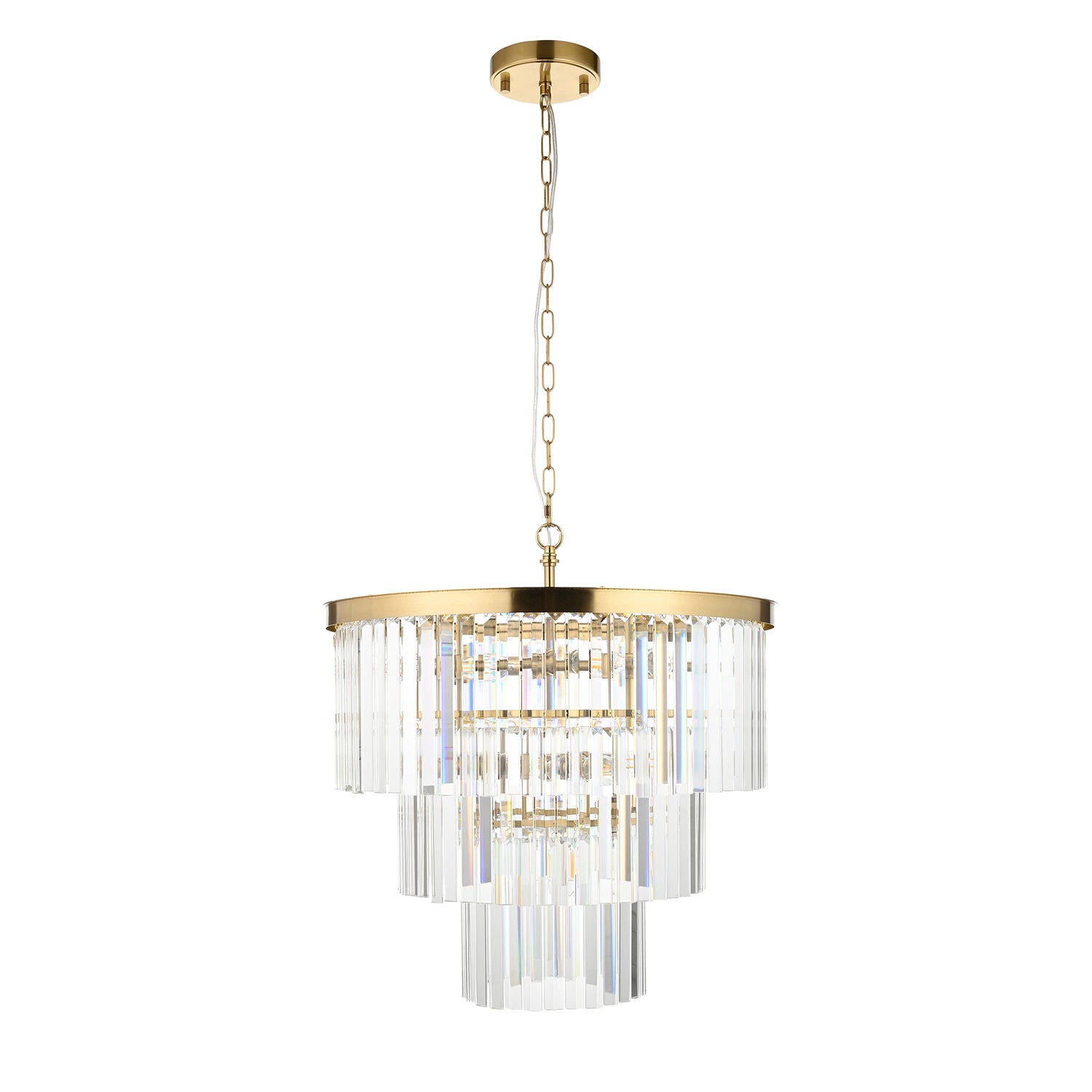 Opulent and eye-catching, this seven-light pendant is a true statement piece featuring cascading tiers of angled glass droppers that shimmer with elegance. The sculptural design is crowned by a shaped metal band in a lustrous brushed brass finish, bringing structure and contrast to the fluid glass arrangement. Suspended from a height-adjustable chain, it offers a luxurious focal point ideal for grand entryways, lounge, bedrooms, dining rooms, or stairwells.