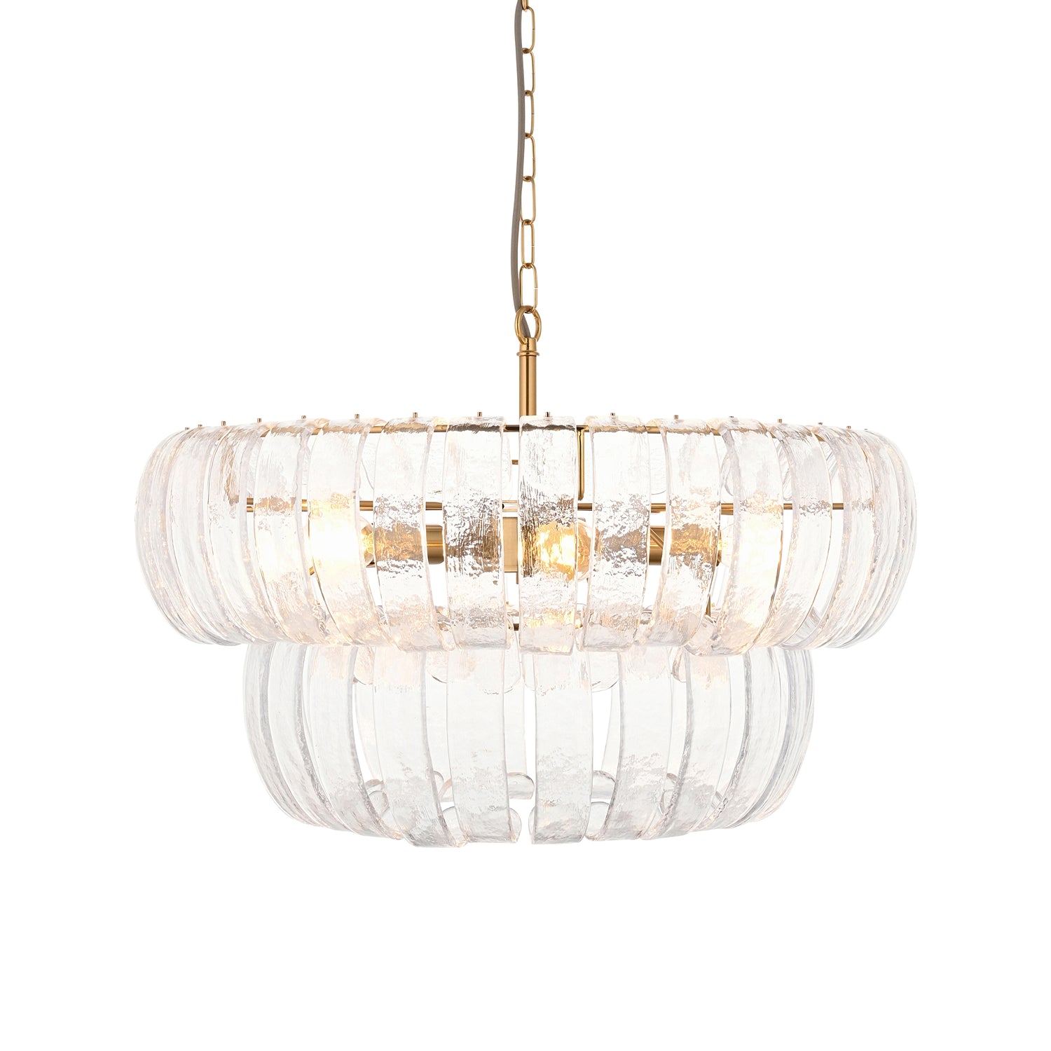 Graceful and sculptural, this 5-light pendant features a stunning arrangement of handmade curved glass pieces that gently cascade in two tiers, creating a soft, shimmering halo effect. The glass is framed by a warm metallic structure and suspended from a height-adjustable chain with an elegant grey braided fabric flex. Perfect for dining rooms, entryways, or high-ceilinged living spaces, it offers timeless craftsmanship with a modern twist.