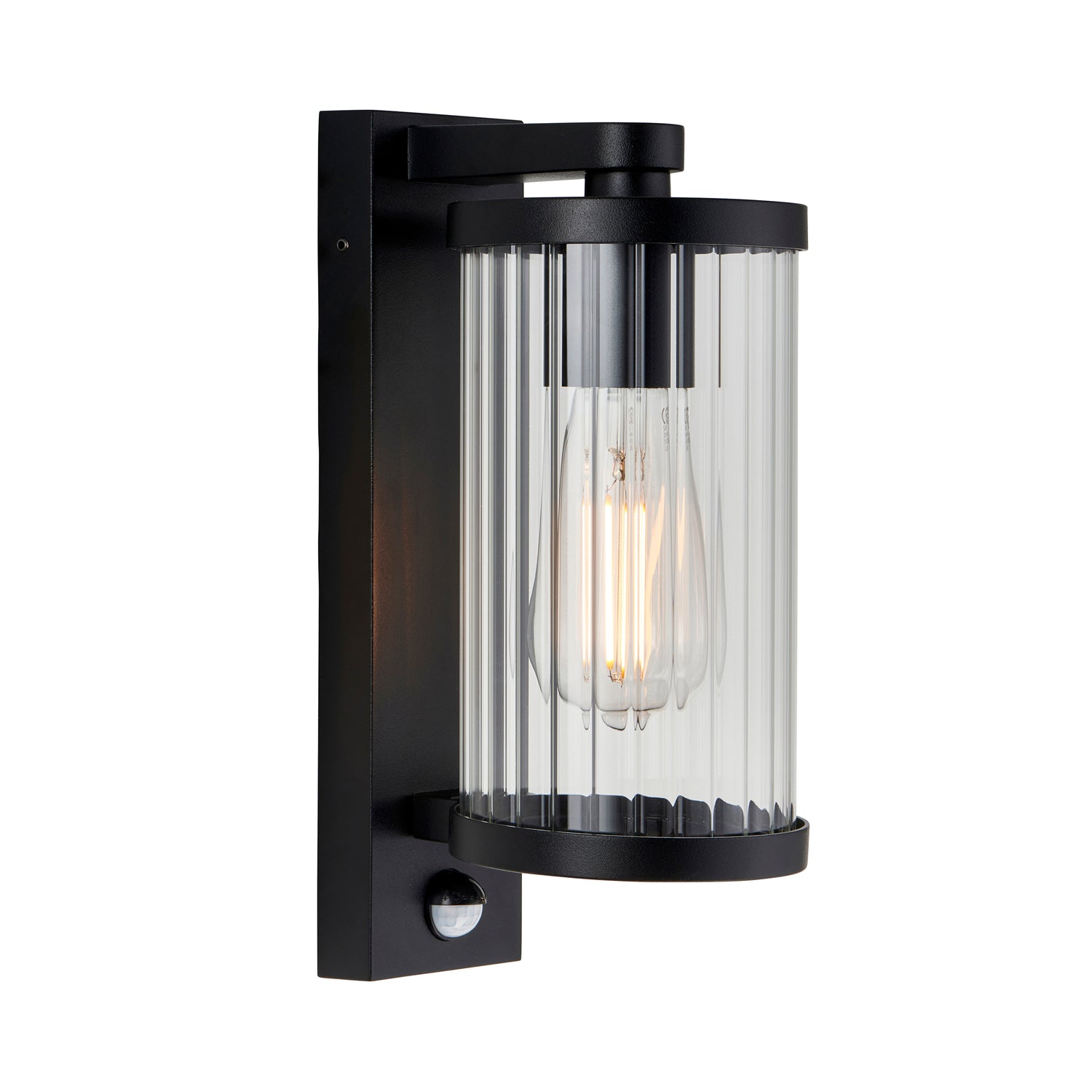 Contemporary and practical, this black painted exterior wall light features a sleek cylindrical design with clear ribbed glass panels that enhance light diffusion and visual texture. An integrated PIR sensor provides motion-activated illumination for added security and convenience, making it ideal for entryways, pathways, or garden walls. Built for durability and weather resistance, it combines smart functionality with clean, modern lines.