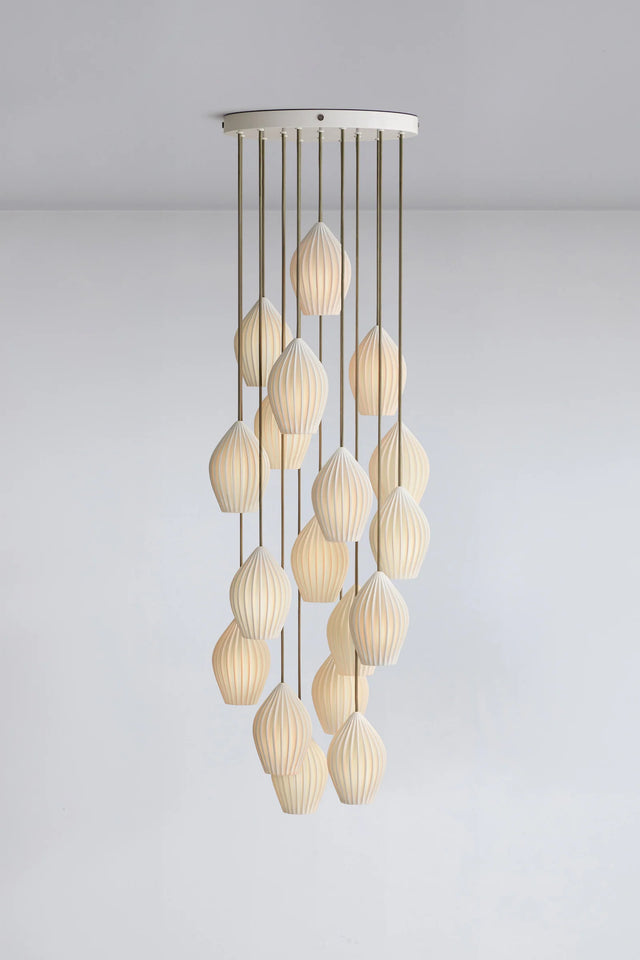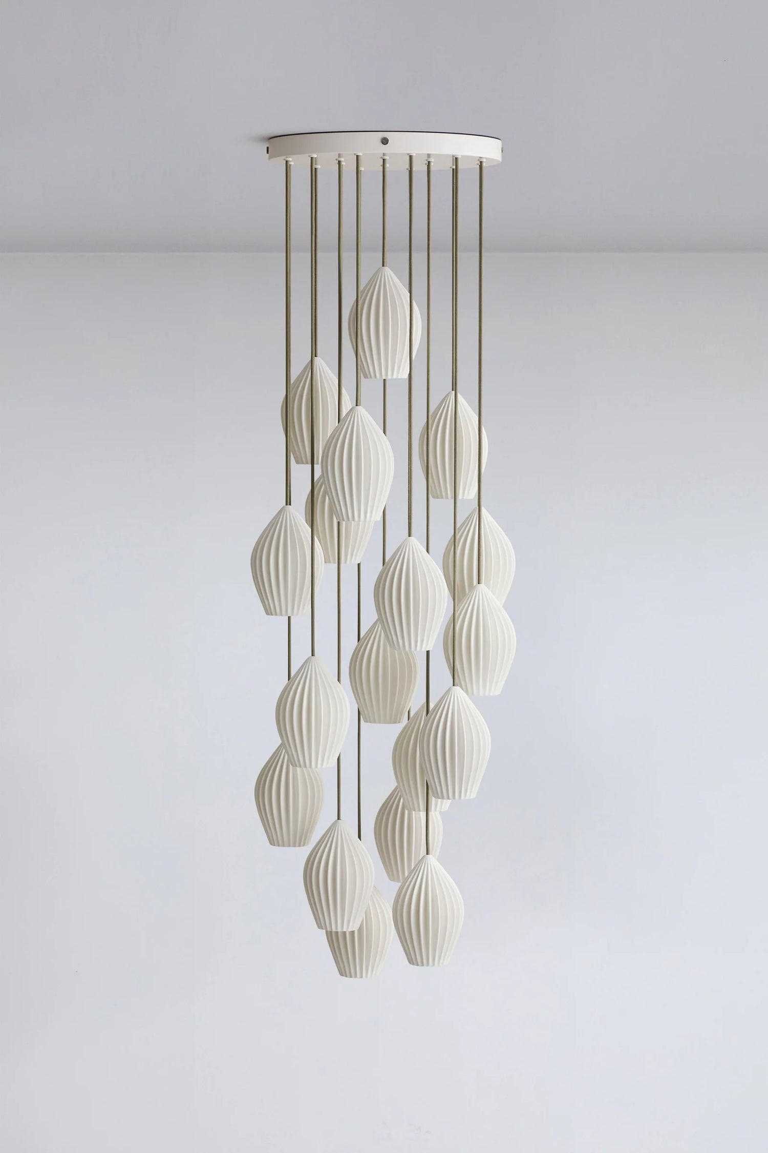 The Original BTC Fin Pendant Grouping of 18 offers a striking centerpiece for expansive spaces such as stairways, hallways, and receptions. Comprising 18 meticulously crafted bone china shades, each pendant provides ample downward illumination while radiating a soft, ambient glow. This arrangement enhances the room’s atmosphere with both function and refined elegance, showcasing a sophisticated design that balances artisanal craftsmanship with powerful visual impact. Ideal for creating a dramatic yet inviting environment.
