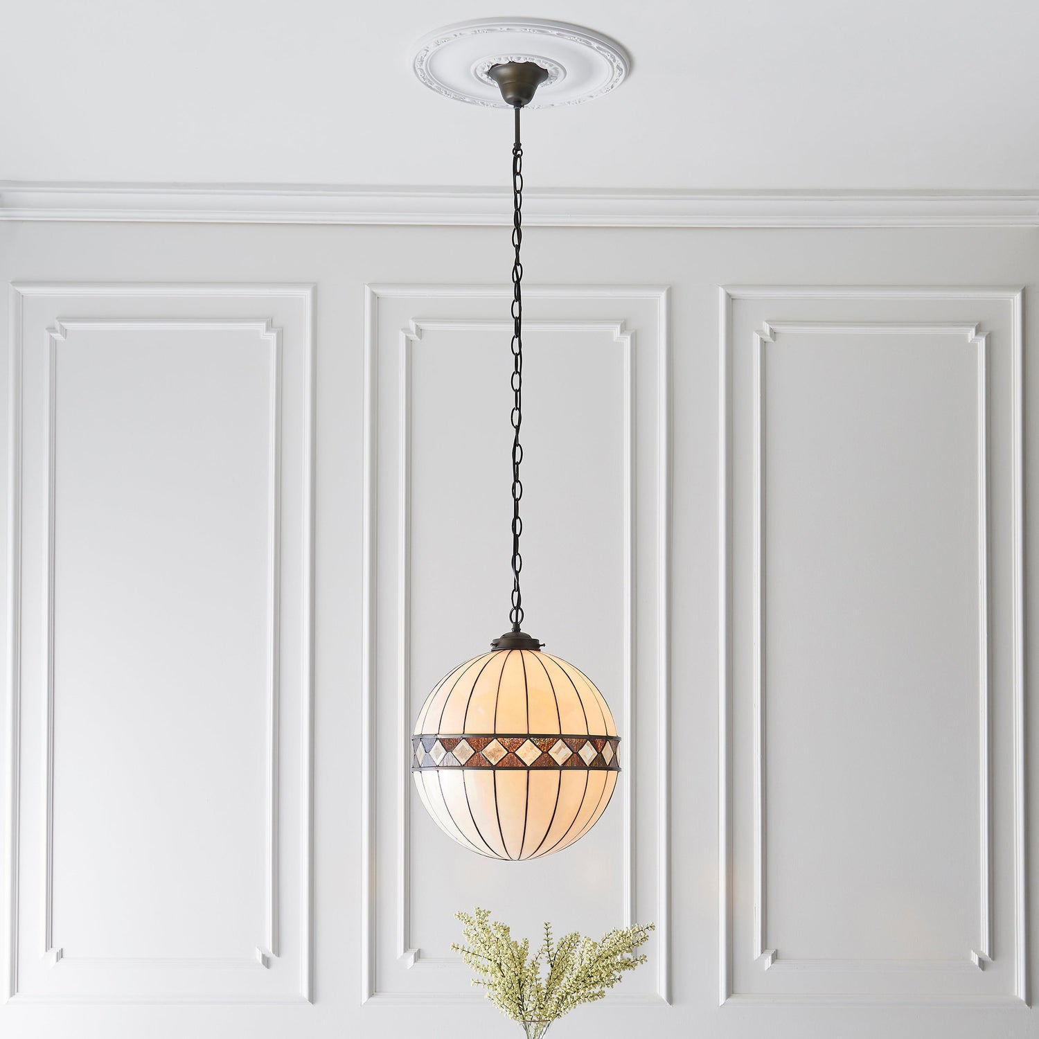 This unusual yet stunning medium globe shaped pendant is a beautifully understated design comprising of clean lines and diamond shaped detailing. Teamed with a bronze effect fitting, dimmable and compatible with LED lamps. Matching items available for a coordinated look.