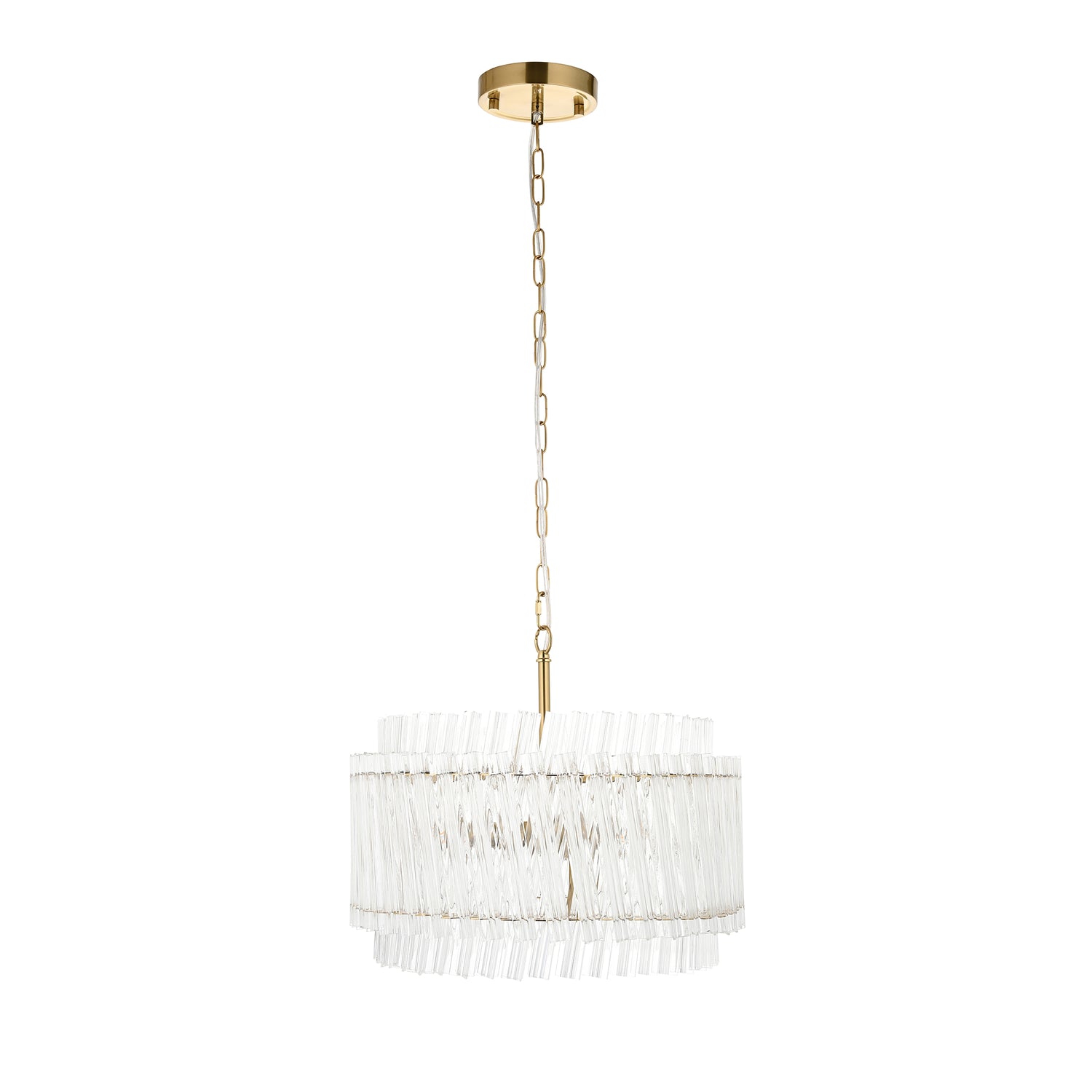 Add a touch of timeless sophistication to your interior with this exquisite 3-light pendant, masterfully crafted with brushed aged brass metalwork and double-layered, high-clarity glass rods that shimmer beautifully when illuminated. Suspended from an adjustable 1.2 m chain with discreet clear flex, it offers both elegance and versatility, allowing you to tailor its presence to your space. The dimmable design lets you create the perfect atmosphere, from soft, ambient glow to striking centrepiece lighting. Designed to pair perfectly with E14 LED filament lamps, this statement piece is where classic luxury meets contemporary refinement.