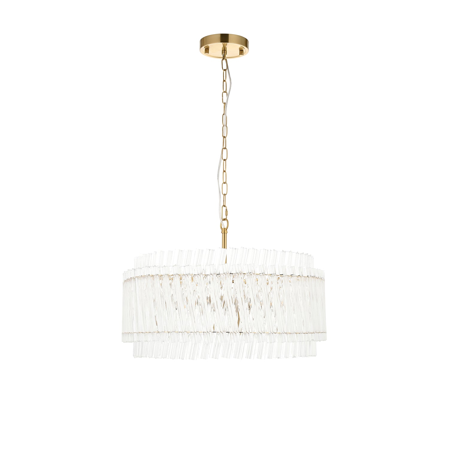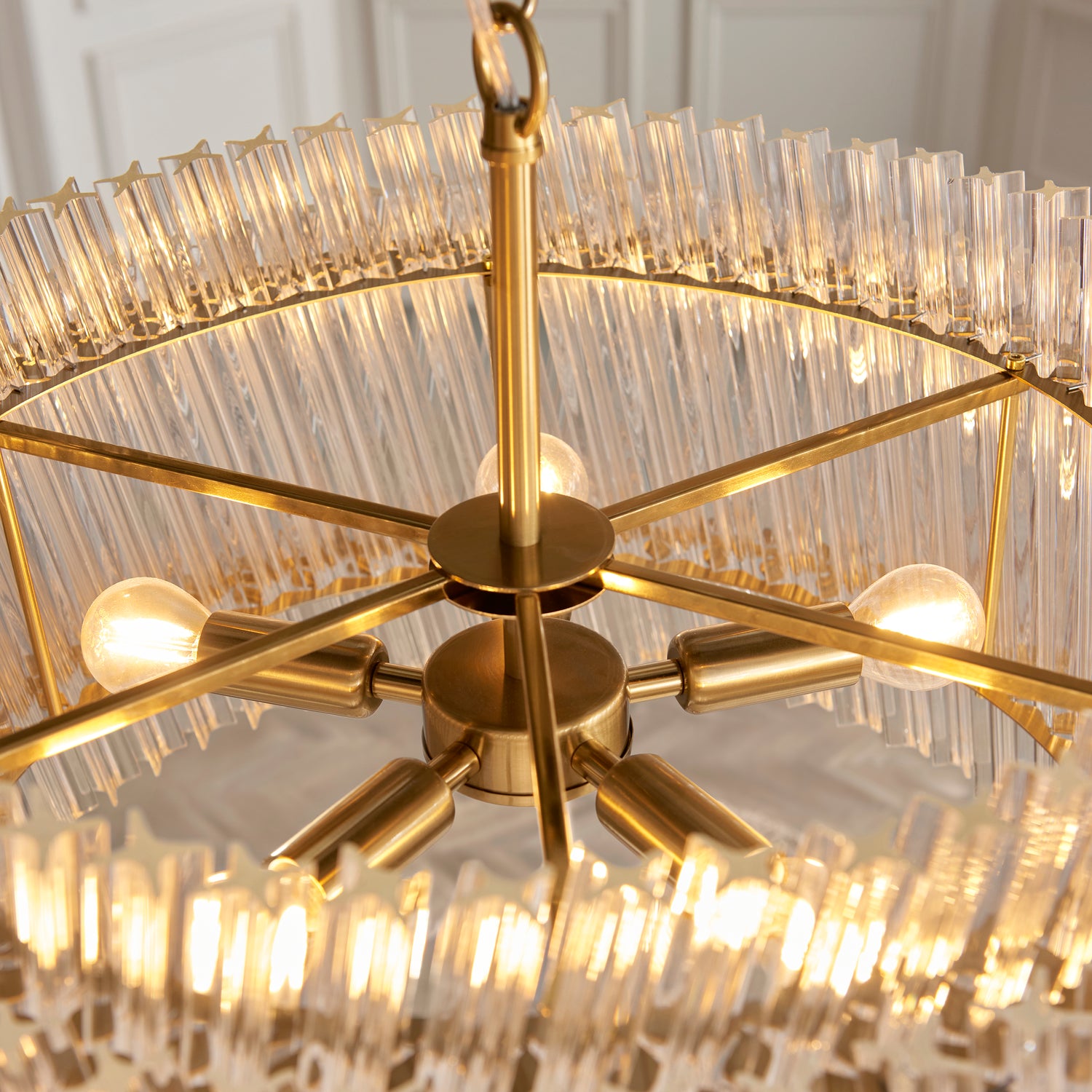 Elevate your interior with the Aquitaine chandelier, a sophisticated 5-light fixture that seamlessly blends timeless elegance with contemporary design. Crafted from brushed aged brass and featuring double-layered, high-clarity glass rods that catch light beautifully, this statement piece commands attention in any room. The adjustable 1.5m chain with clear flex allows flexible positioning, whilst the dimmable functionality lets you transition effortlessly from intimate ambient lighting to dramatic focal-point illumination. Designed for E14 LED filament lamps, it delivers both luxury and practicality for discerning interiors.