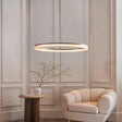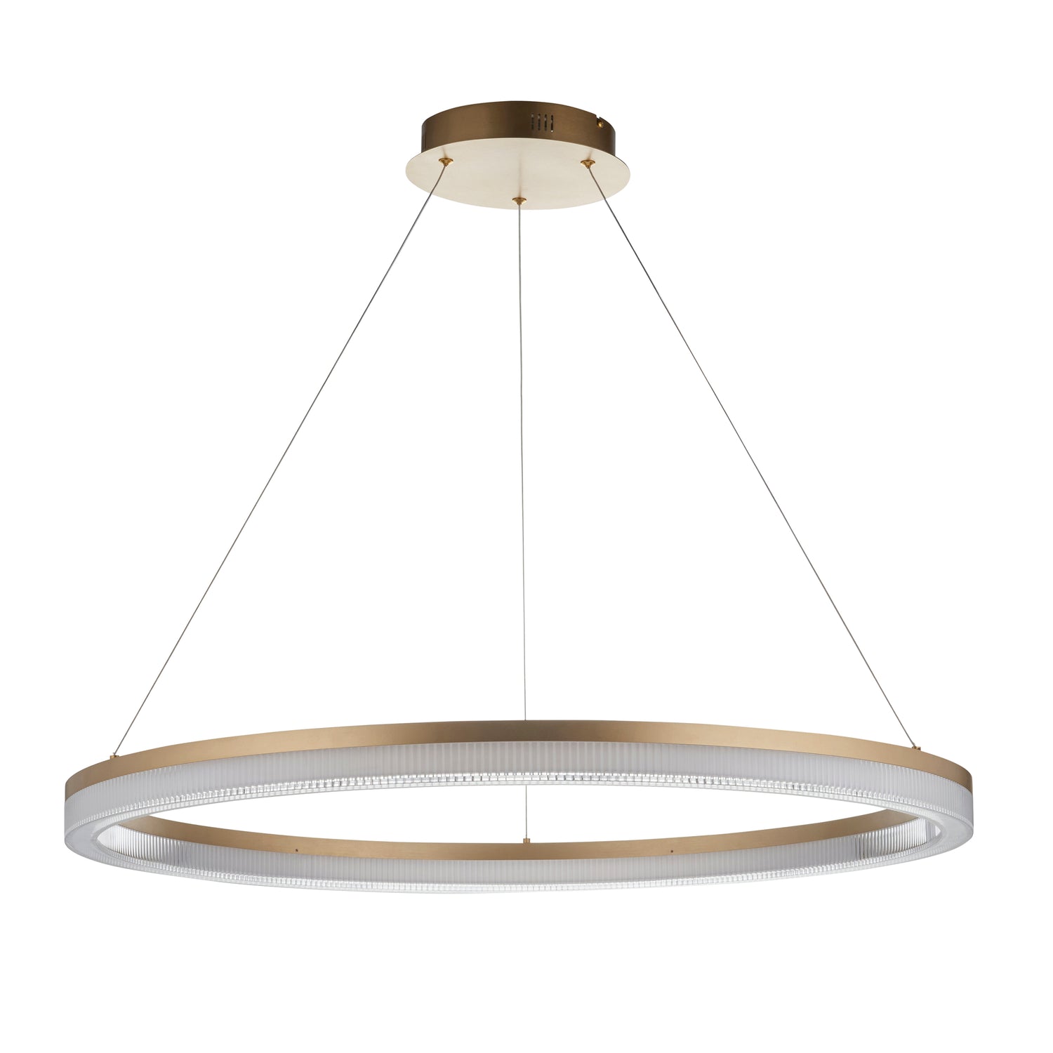 Elevate interiors with this sleek and contemporary hoop pendant light. Featuring a large circular ring suspended by three discreet wires from a round ceiling mount, this fixture combines minimalist design with high functionality. Finished in brushed gold plated metal work with a ribbed opal acrylic diffuser, this pendant is an ideal fit for contemporary interiors.