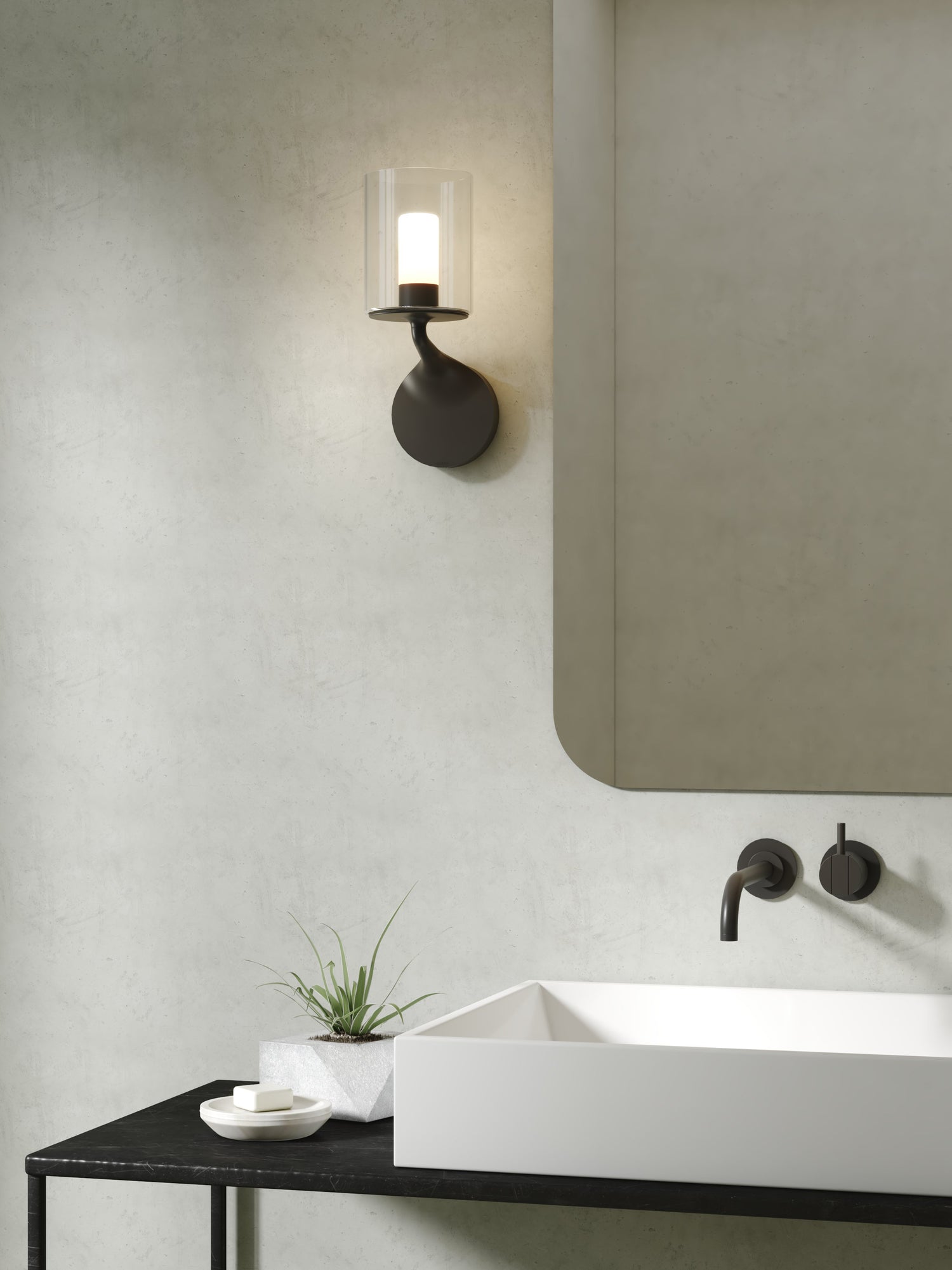 A contemporary classic, the Elena bathroom wall light sits comfortably in both contemporary and traditional spaces. Its durable, die-cast arm, shaped like a suspended droplet, comes in polished chrome or matt black; the shade is hand-blown glass. It provides shadow-free illumination for shaving or applying make-up. IP44 rated for use in wet areas.