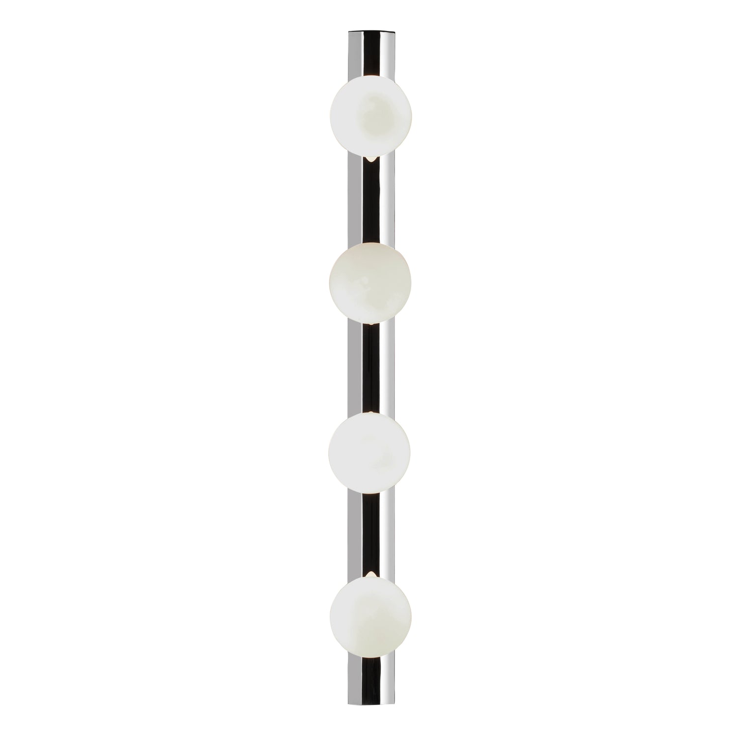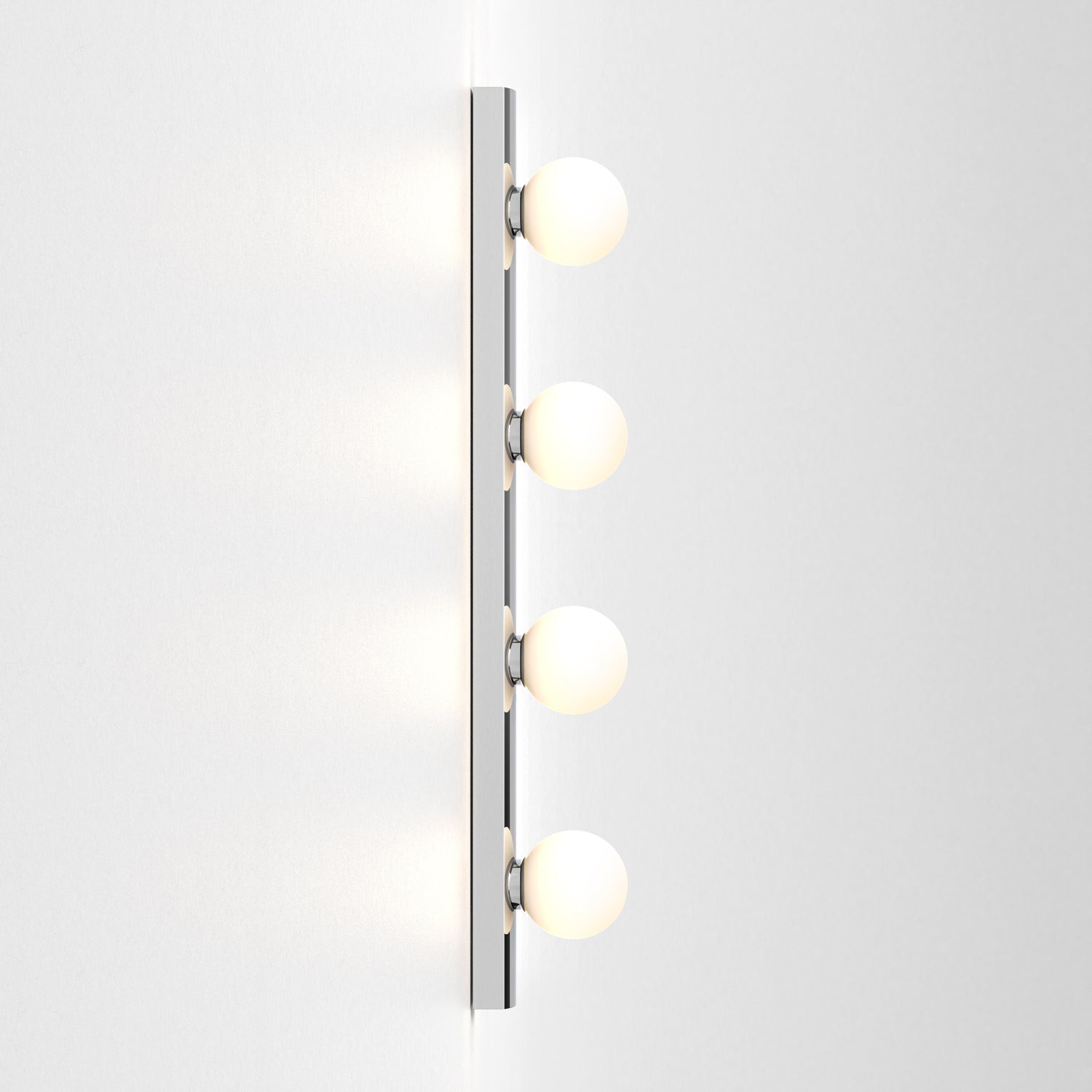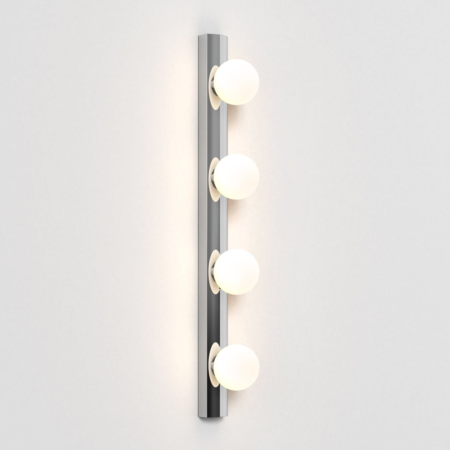 A contemporary take on the classic Hollywood mirror, this wall light features a slender polished chrome body and four blown glass globes for bright, even illumination. Intended for bathrooms or dressing rooms, it can be positioned both horizontally or vertically around a mirror and comes unswitched to work seamlessly with integrated lighting schemes.
