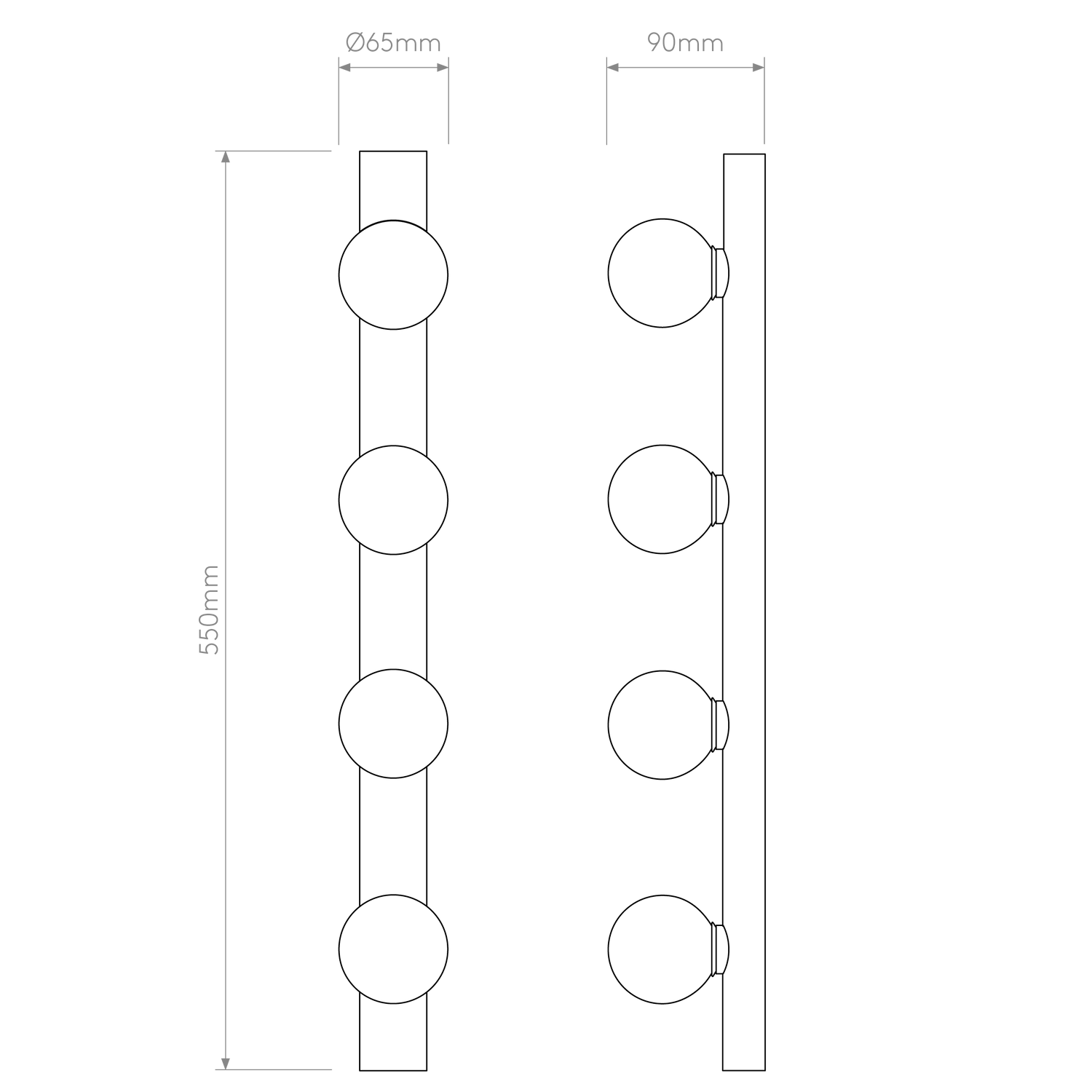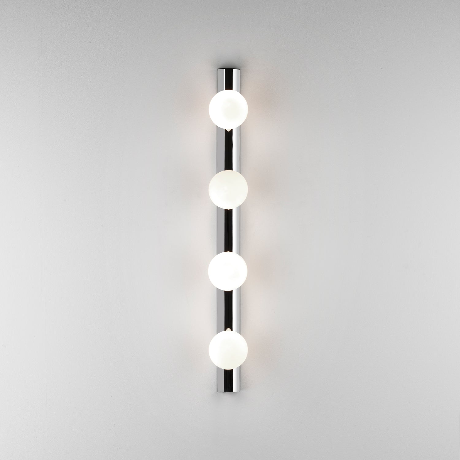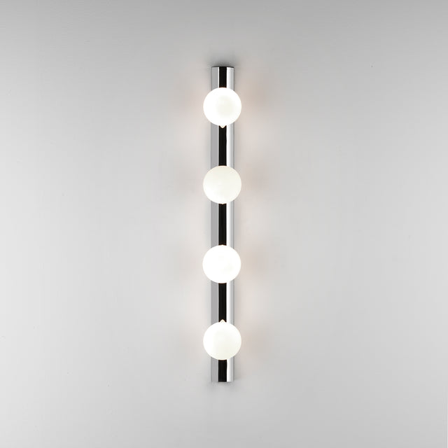 A contemporary take on the classic Hollywood mirror, this wall light features a slender polished chrome body and four blown glass globes for bright, even illumination. Intended for bathrooms or dressing rooms, it can be positioned both horizontally or vertically around a mirror and comes unswitched to work seamlessly with integrated lighting schemes.