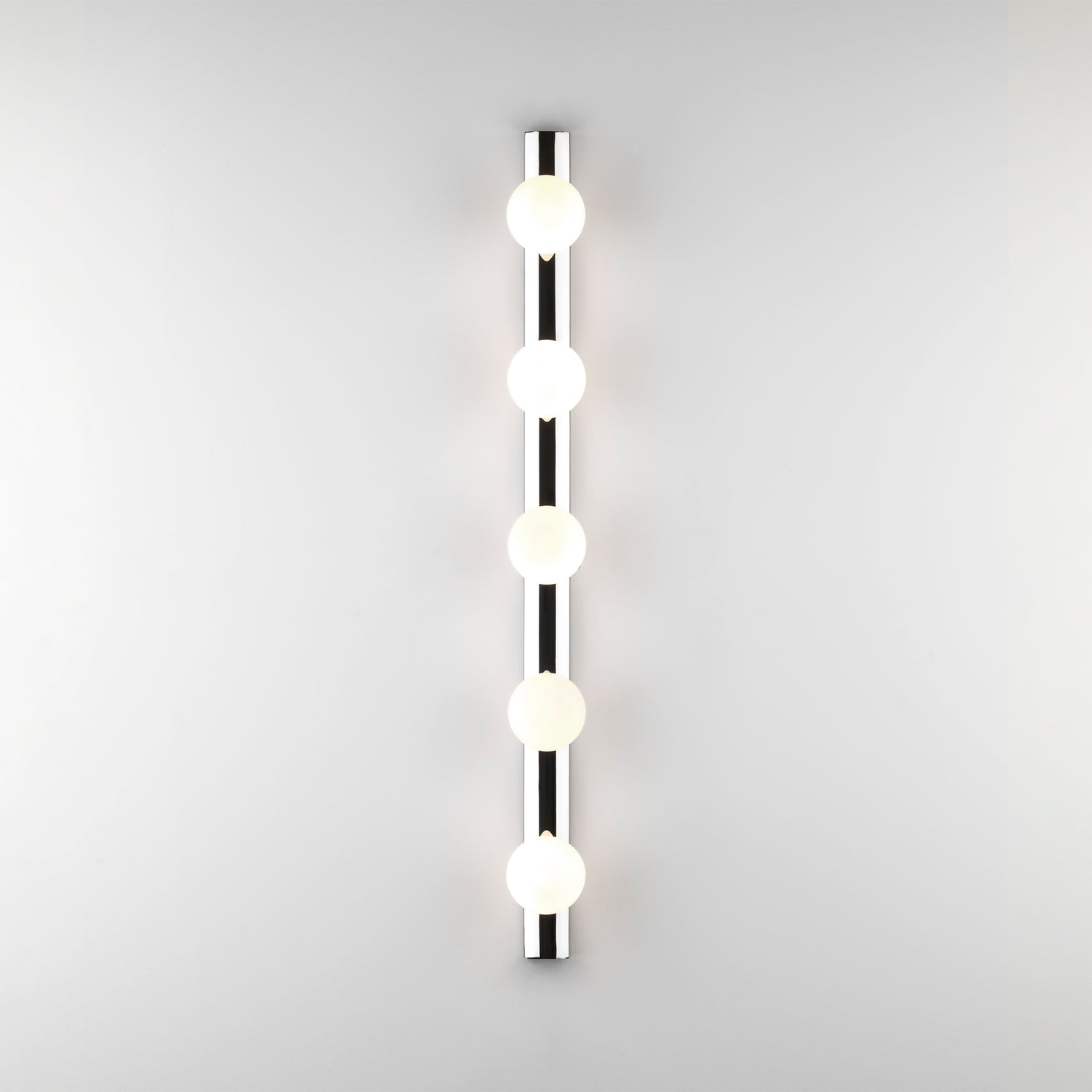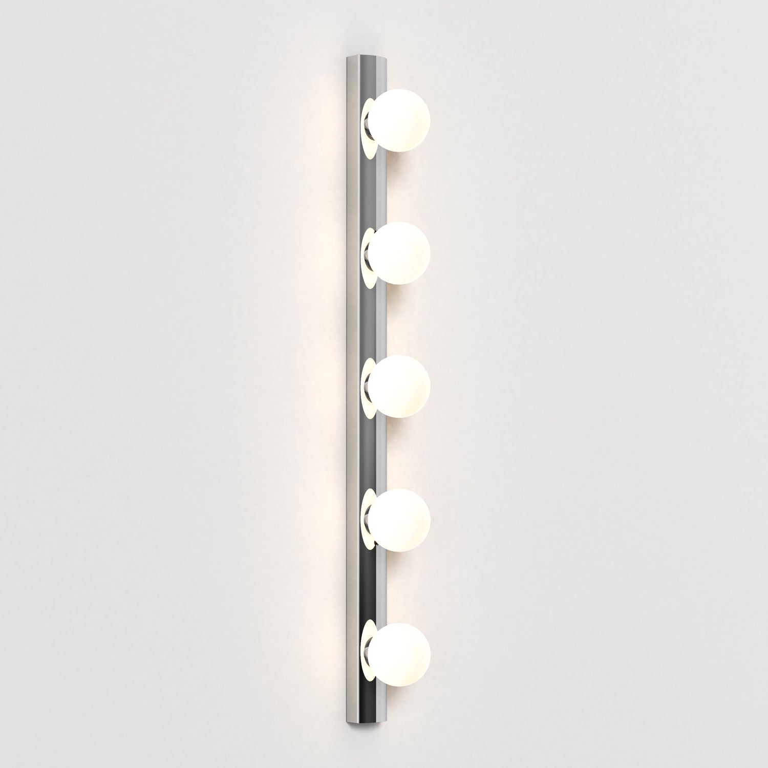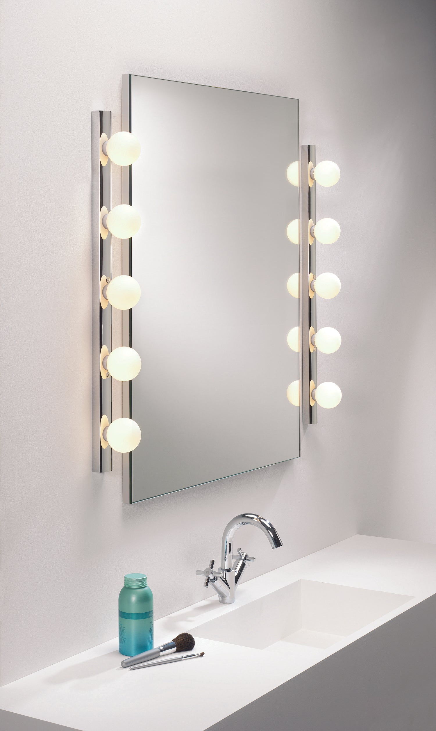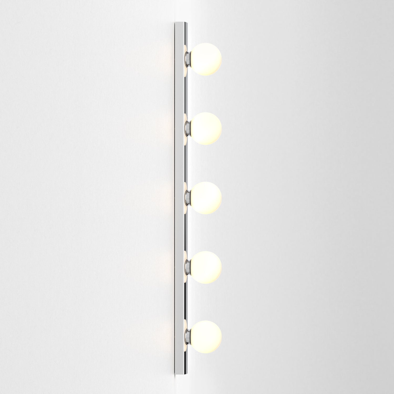 A contemporary take on the classic Hollywood mirror, this wall light features a slender polished chrome body and blown glass LED globes for bright, even illumination. Intended for bathrooms or dressing rooms, it can be positioned both horizontally or vertically around a mirror and comes unswitched to work seamlessly with integrated lighting schemes.