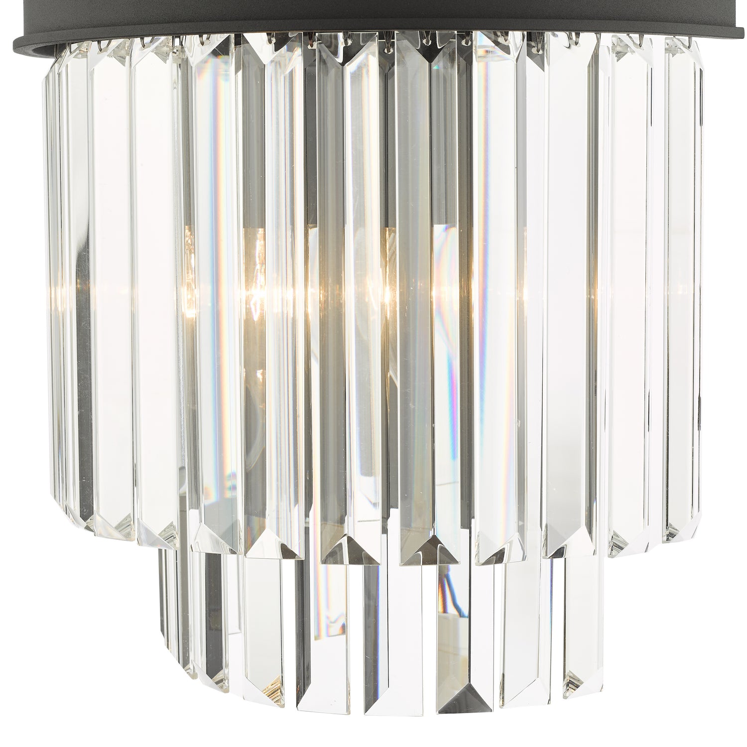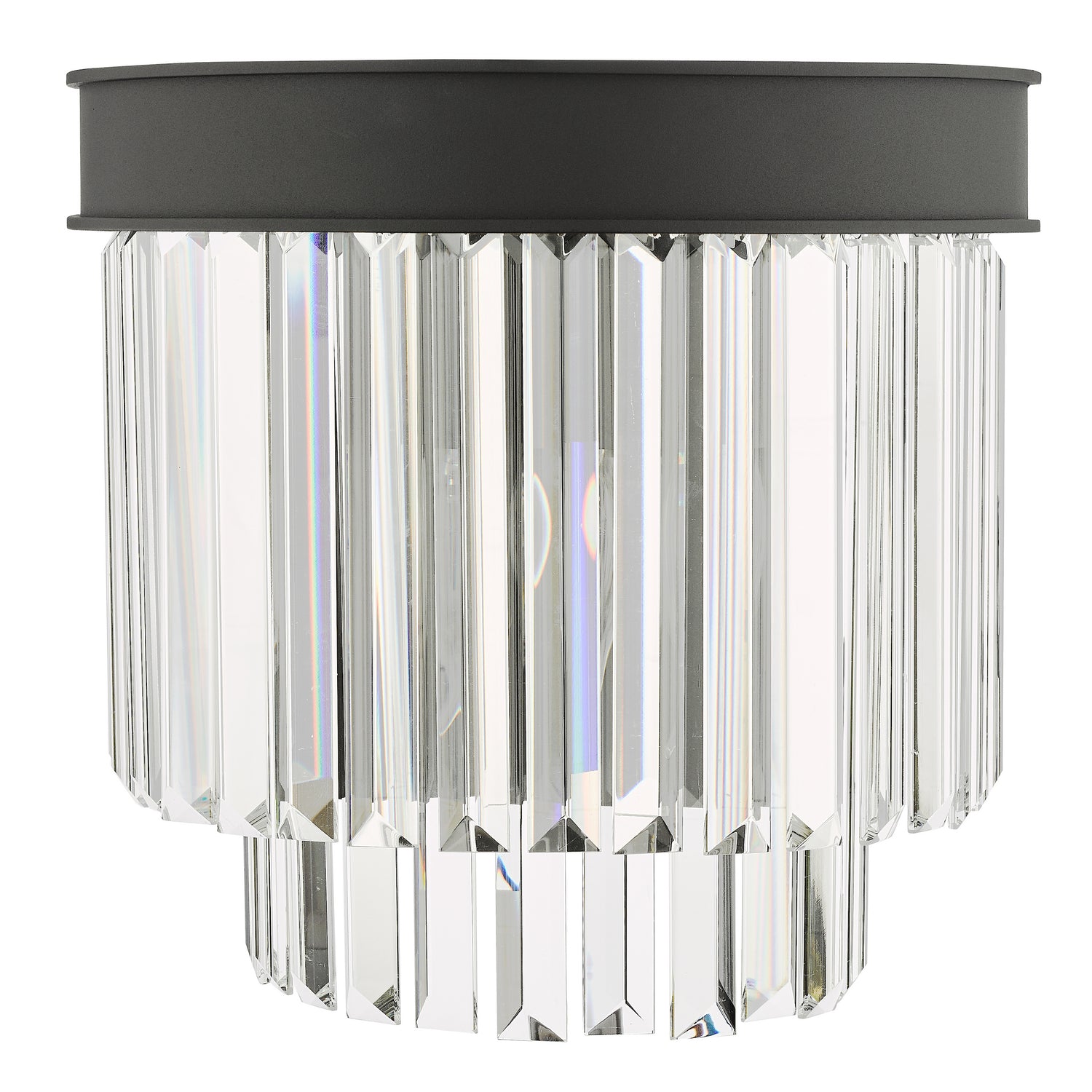 The Dar Celeus 2 Light Wall Light brings stunning elegance to your walls with its combination of clear faceted crystal and sophisticated textured anthracite finish. Meticulously designed with concealed crystal fittings within the anthracite frame, this beautiful wall light serves as the perfect complement to the Celeus chandeliers and ceiling lights, whilst also making a striking statement when used independently.