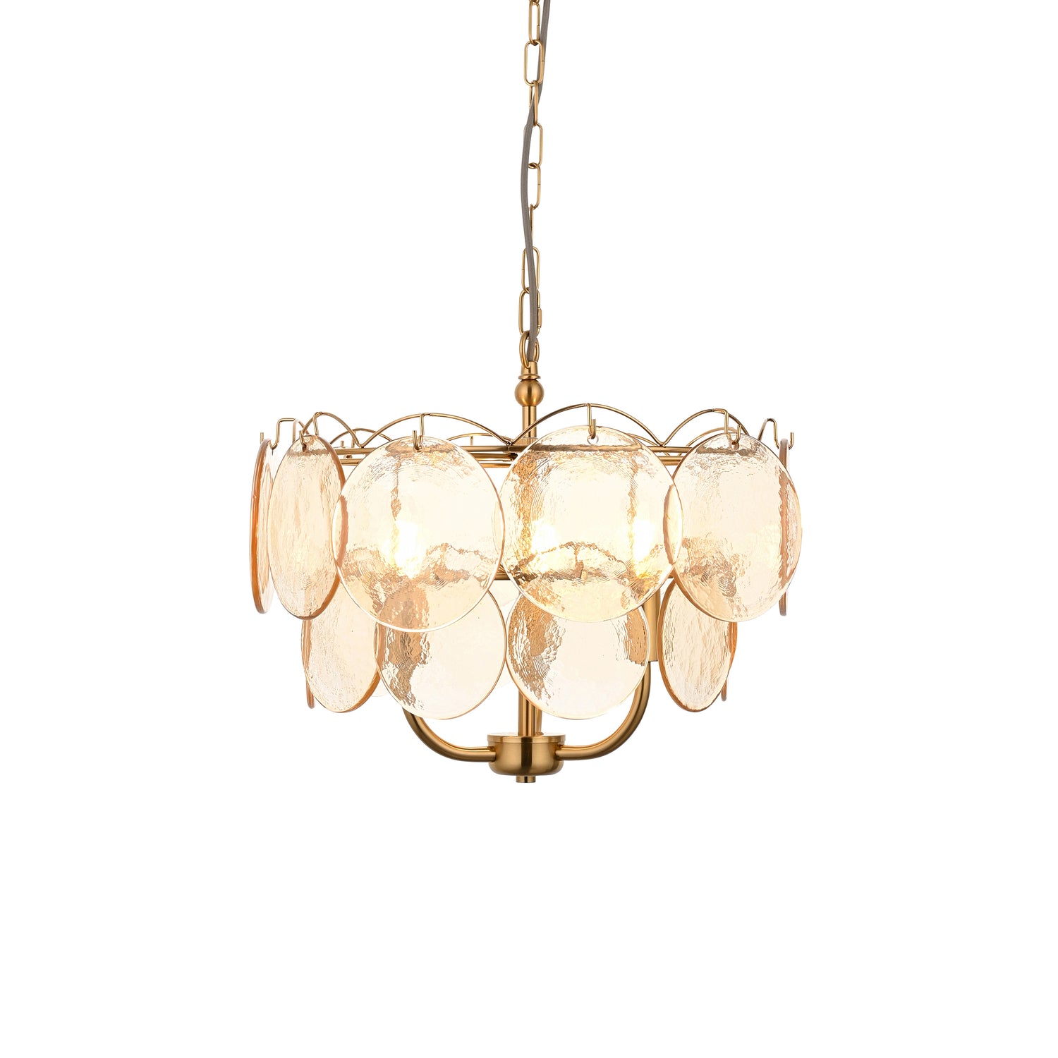 Handcrafted champagne glass discs cascade elegantly from a brushed aged brass fitting in this striking three-light pendant. The two-tiered composition creates sophisticated visual depth, whilst the artisanal glass work ensures each piece possesses unique character. Ideal for making a refined statement in contemporary or transitional interiors. A five-light variant is available for those seeking enhanced presence and luminosity.