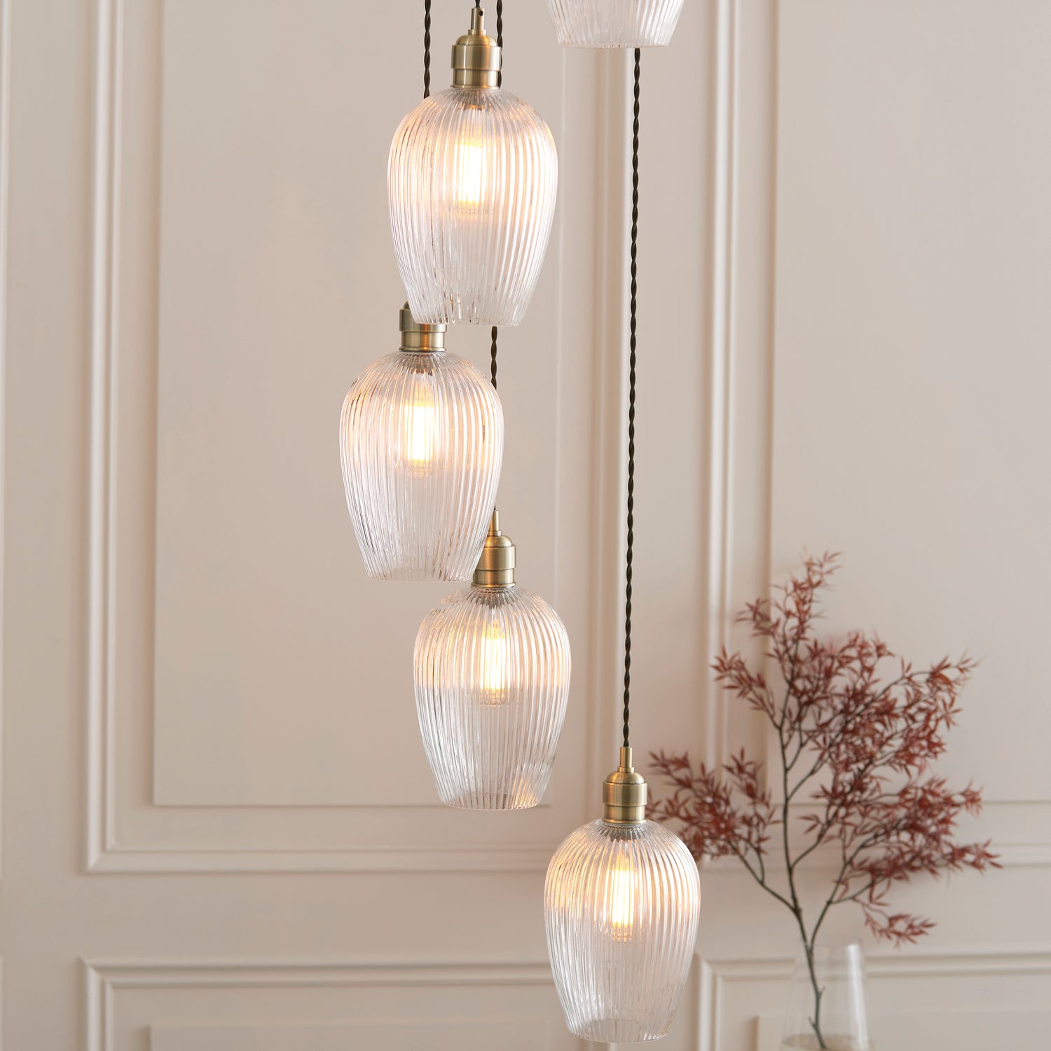 Make a statement with this elegant 7-light cascade pendant, engineered for high-ceiling spaces where dramatic lighting becomes architectural focal point. The design accommodates diverse interior aesthetics, transitioning seamlessly between contemporary and traditional settings. Choose between bright nickel or antique brass finishes, paired with clear or ribbed glass options to suit your aesthetic preferences. The cascading arrangement creates layered illumination whilst serving as a striking visual feature. Coordinating pieces available to complete your scheme.