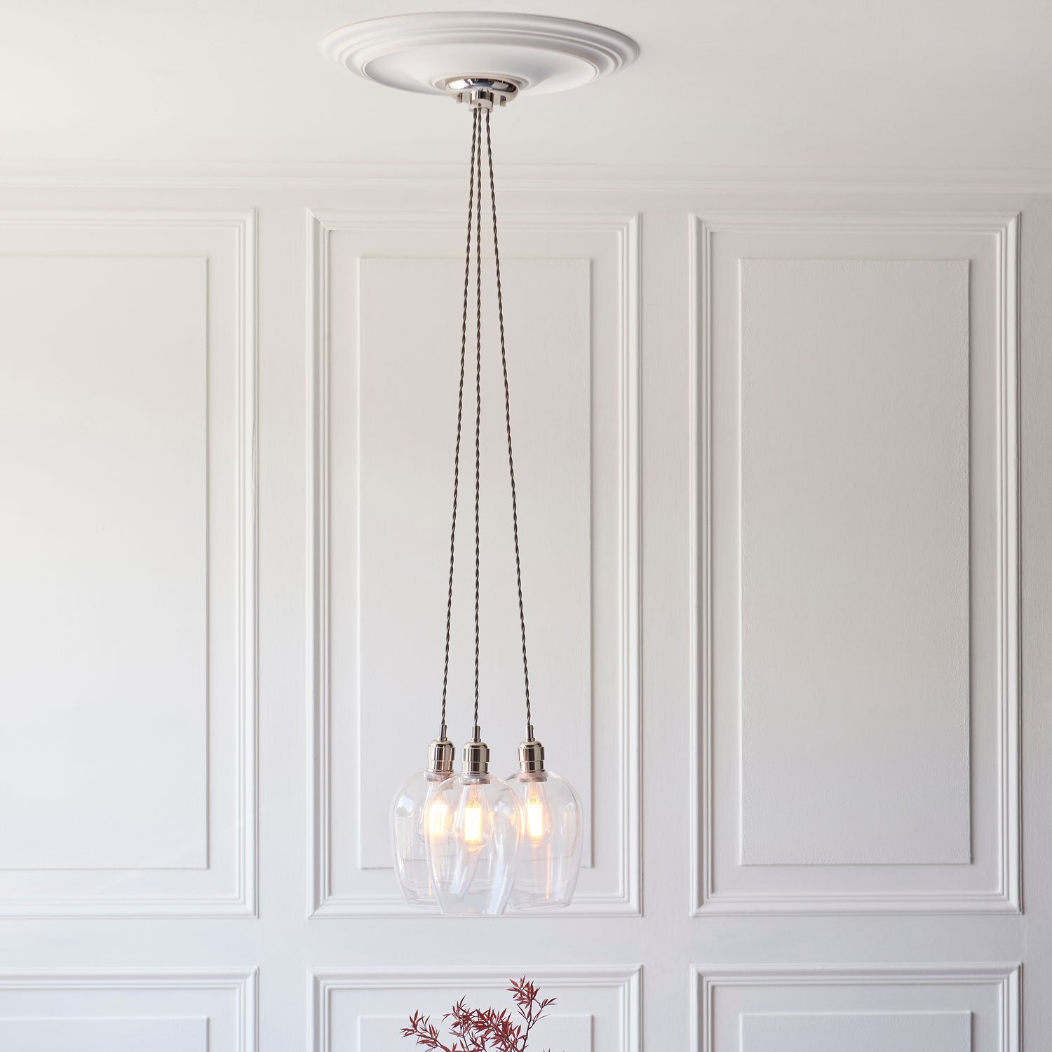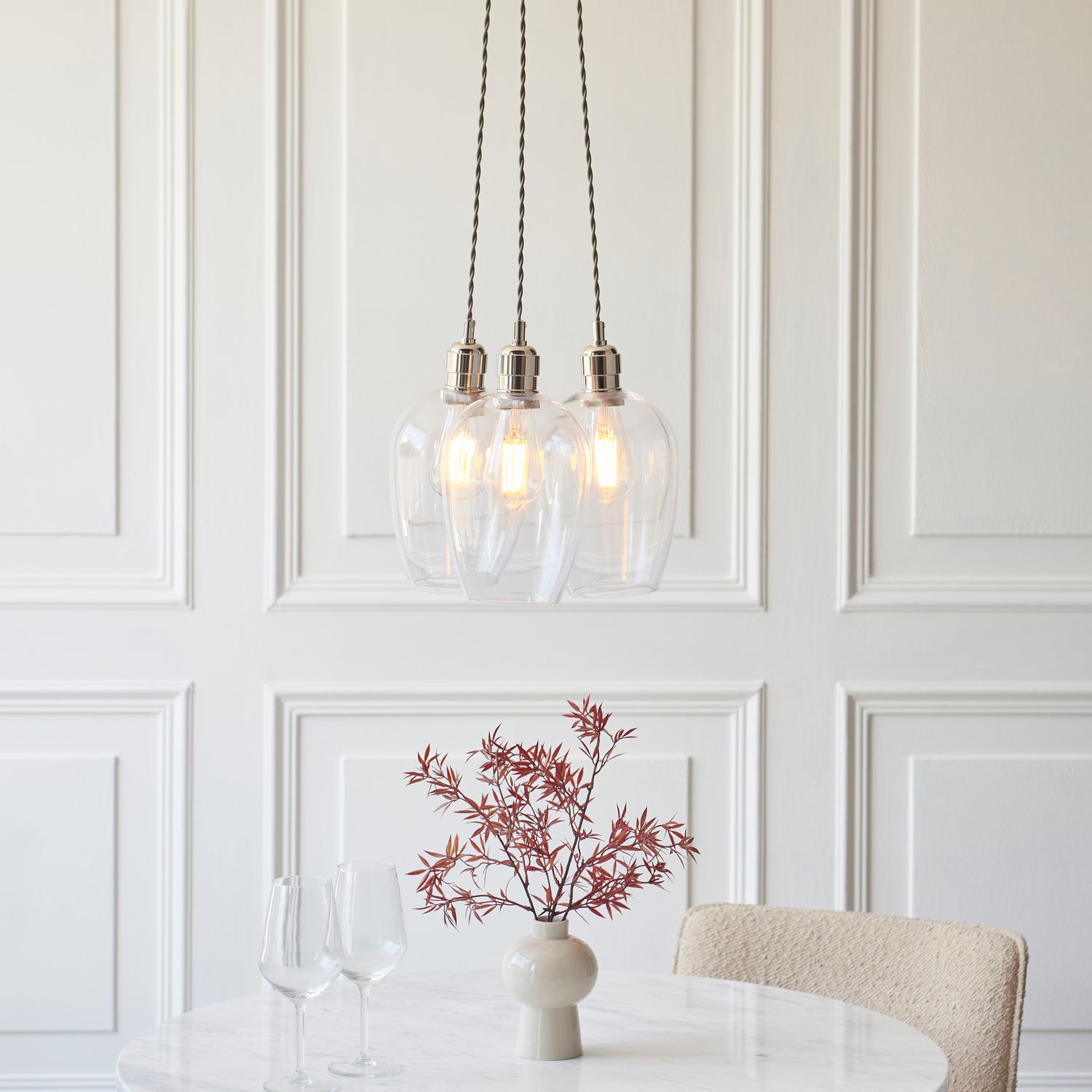 This elegant three-light cluster pendant delivers understated sophistication to contemporary and traditional interiors alike. Available in bright nickel or antique brass finishes paired with your choice of clear or ribbed glass, it provides a gentle, diffused illumination that complements diverse décor schemes. The refined design works beautifully as a standalone statement or coordinated with matching pieces from the collection to create a cohesive lighting scheme throughout your space.