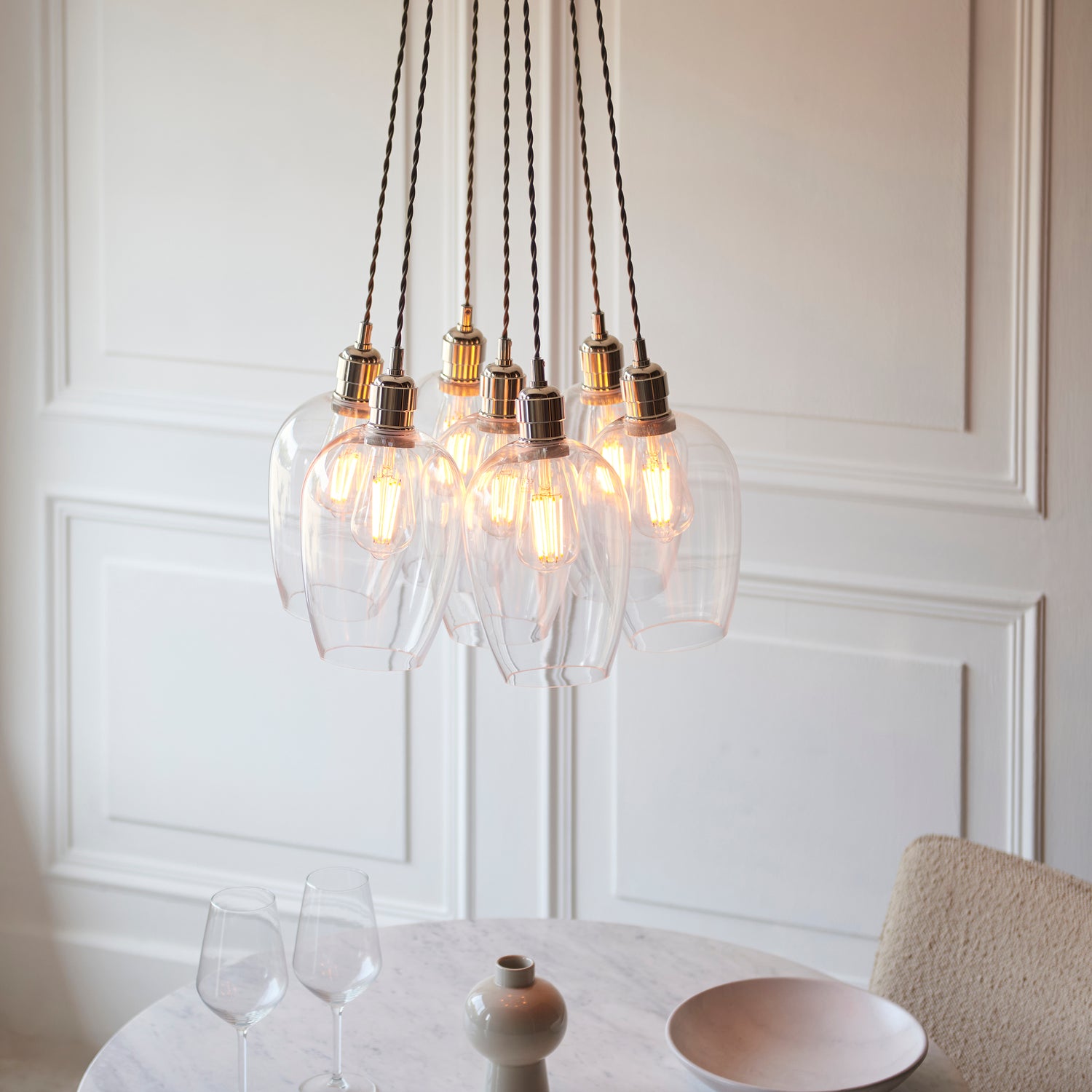 Designed with all interiors in mind, this 7-light cluster pendant is a versatile look that makes a statement. Choose from a bright nickel or antique brass finish, with clear or ribbed glass. Matching items in this collection are available to create a cohesive look.