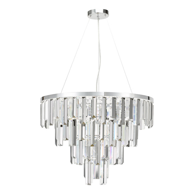 Elevate your space with the stunning Dar Fuentes 5 Light Pendant, a luxurious chandelier that combines polished chrome with dazzling crystal accents. This elegant pendant light features five radiant crystal-encrusted lights, creating a beautiful interplay of light and reflections that will capture attention in any room. The polished chrome finish complements the crystal details, adding modern sophistication and timeless glamour to your home.
