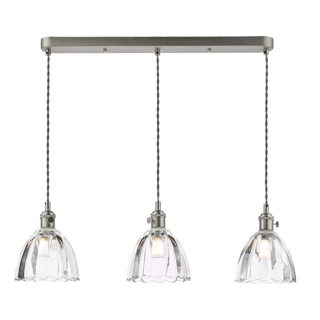 Illuminate your space with the Dar Hadano 3-Light Bar Pendant, featuring an elegant Antique Chrome finish and scalloped bell glass shades. Perfect for kitchens, dining areas, or living rooms, this pendant light adds a touch of vintage charm and modern sophistication.