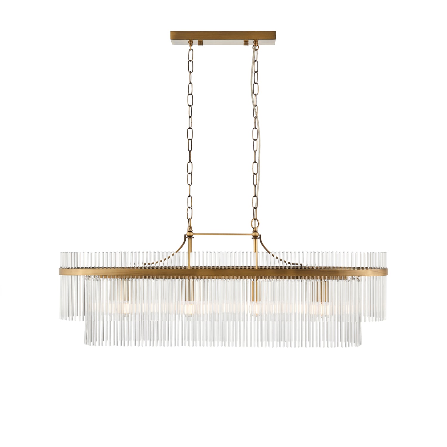 This linear 4 light pendant is perfect for adding a classic timeless look to dinning rooms. Finished in antique brass and decorated with clear glass rods that delicately diffuse the light, suspended from height adjustable chain, with clear flex.. Perfect for elevating your interiors, this piece blends timeless design with contemporary sophistication to create a stunning focal point.