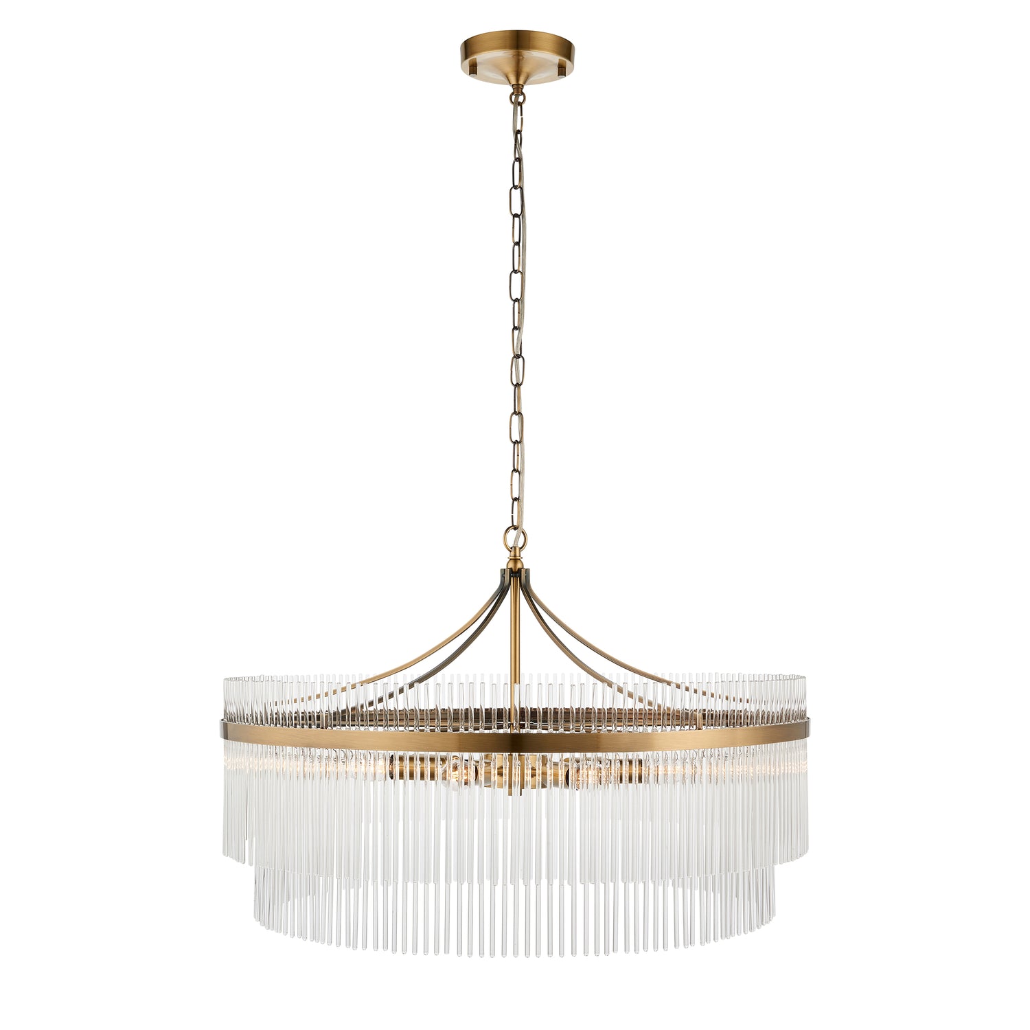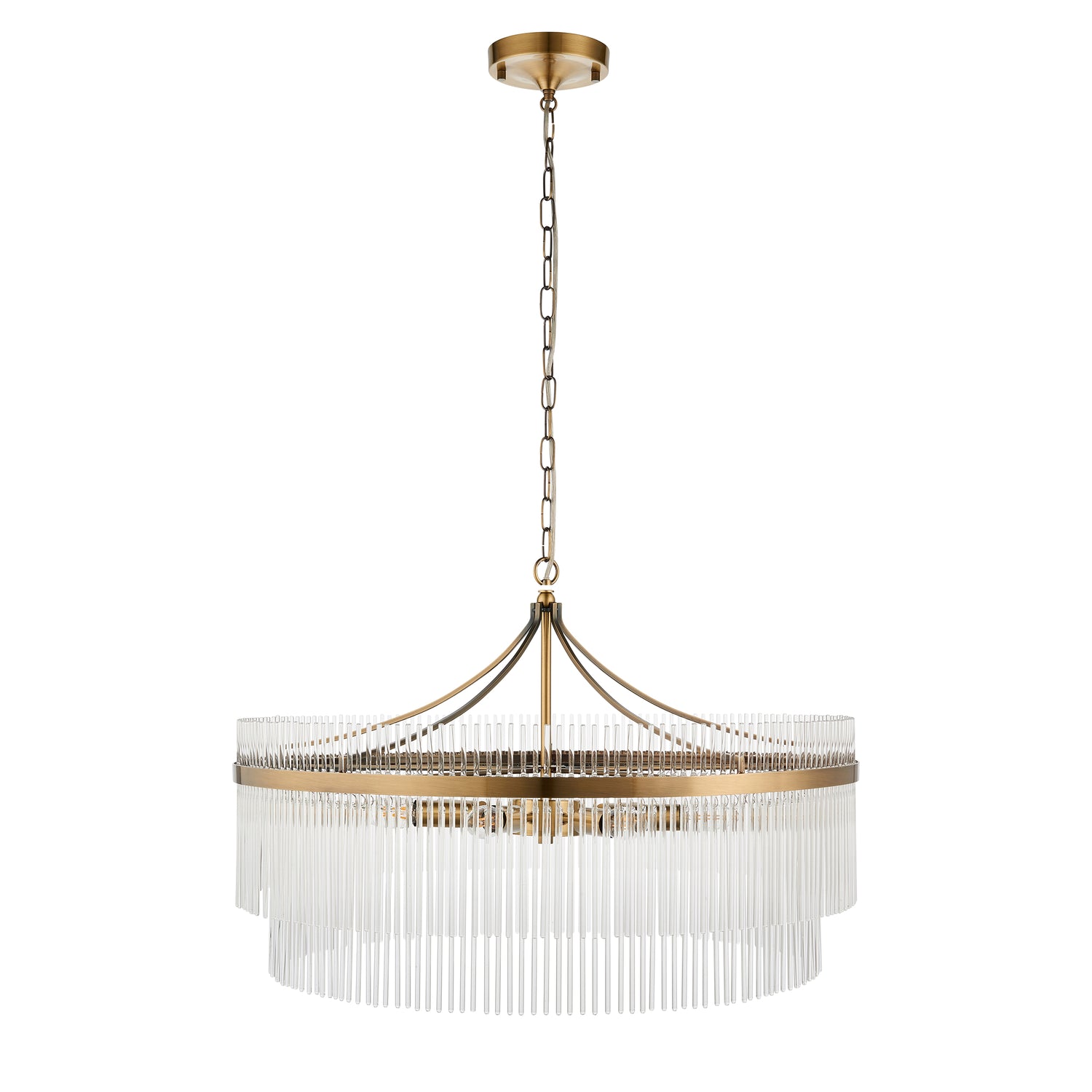 Finished in antique brass and decorated with clear glass rods that delicately diffuse the light, suspended from height adjustable chain, with clear flex. Create an impressive statement with this large 7 light glass pendant.. Perfect for elevating your interiors, this piece blends timeless design with contemporary sophistication to create a stunning focal point.