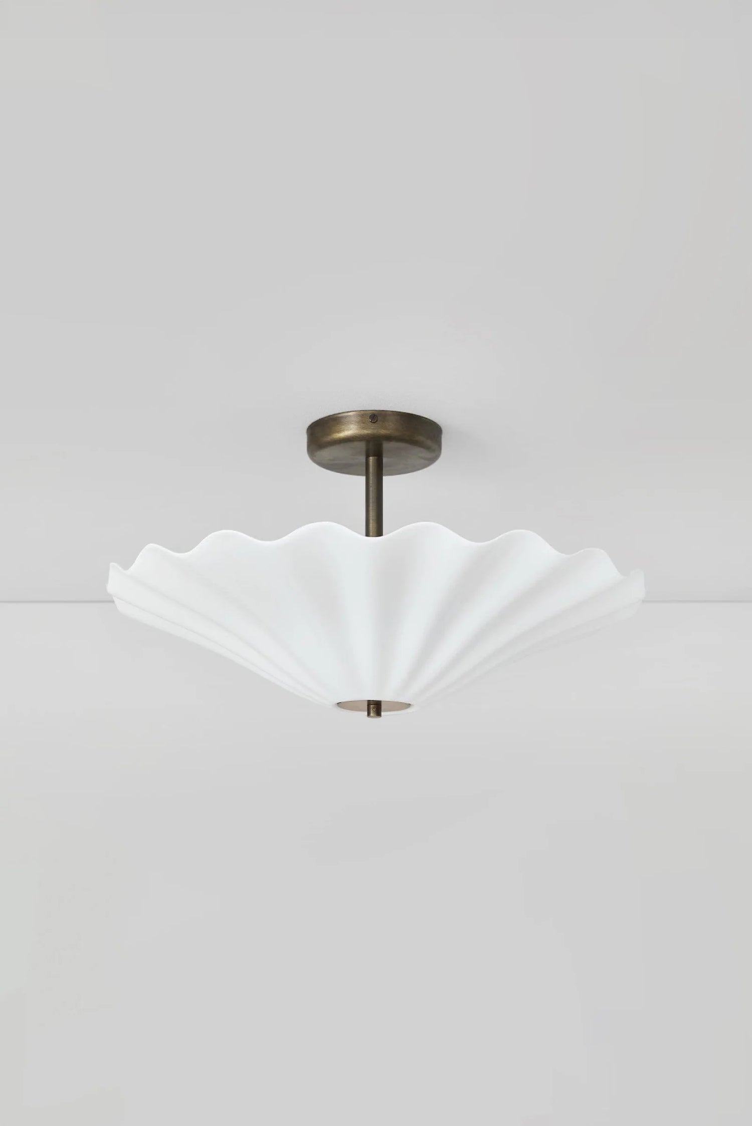 The Original BTC Christie Semi Flush Ceiling Light offers a refined blend of elegance and craftsmanship. Featuring a scalloped, glossy bone china shade inspired by ocean waves, it is paired with a rich antique brass disc and finial. This design softly reflects light from two bulbs onto the ceiling, creating ambient indirect illumination that enhances any space with subtle sophistication. Ideal for those seeking a statement piece that elevates both style and atmosphere.