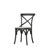 A pack of 2 understated cross back chairs in a distressed black finish with canvas seat pads. Ideal for casual dining creating a relaxed French café feel in the home.