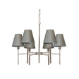 The Lucerne 6lt chandelier is sleek and minimalistic, an ideal companion to modern living spaces. Finished in Brushed Nickel and includes grey shades.