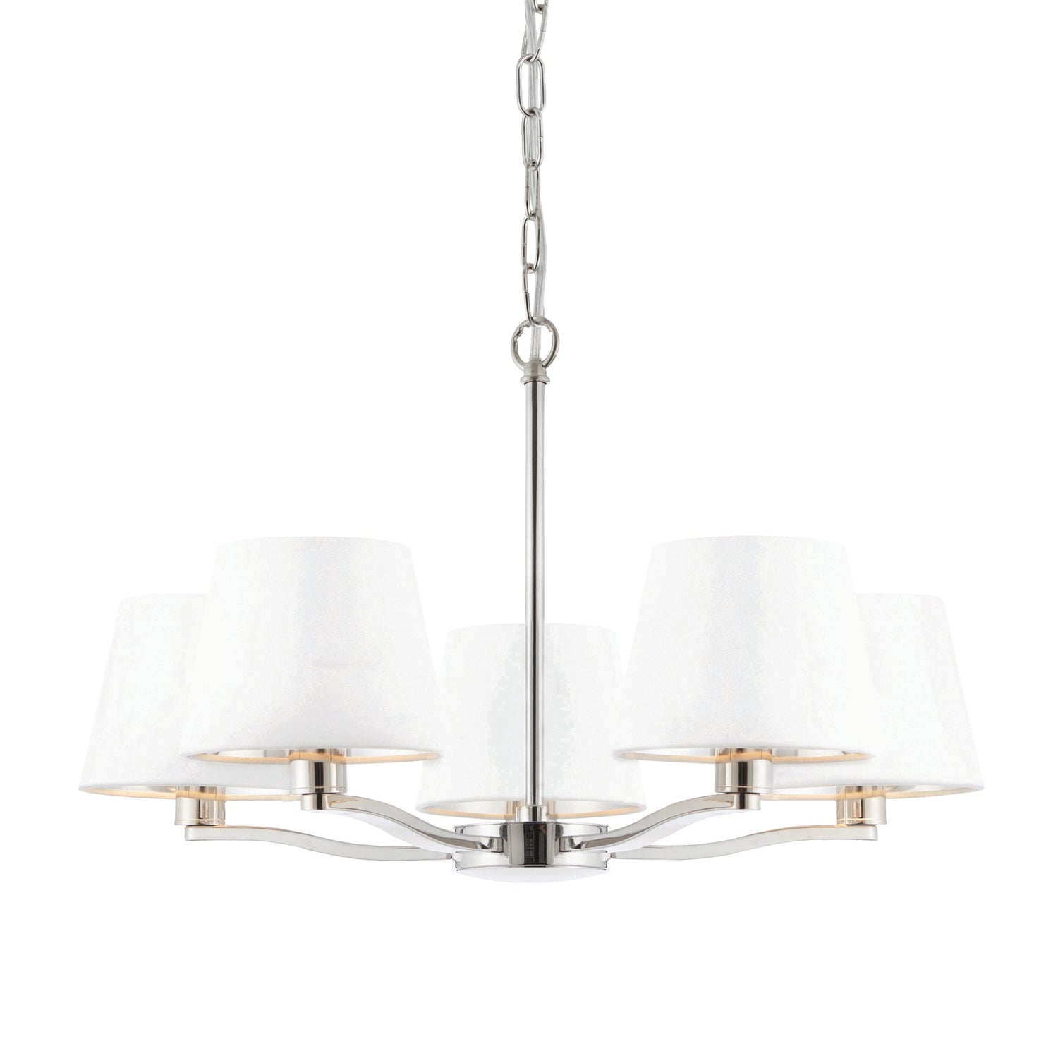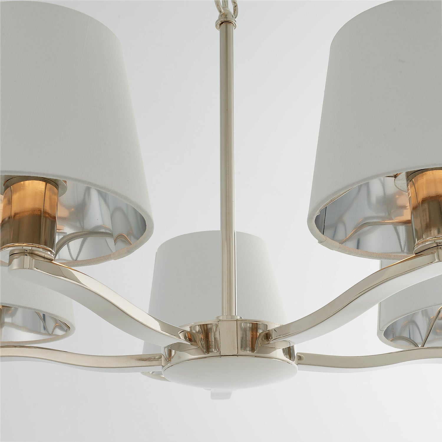 The Harvey 5 light pendant is finished in bright nickel plate and complemented by vintage white, faux silk shades each with metallic silver inner, for the perfect sophisticated boutique hotel look. Matching items also available.