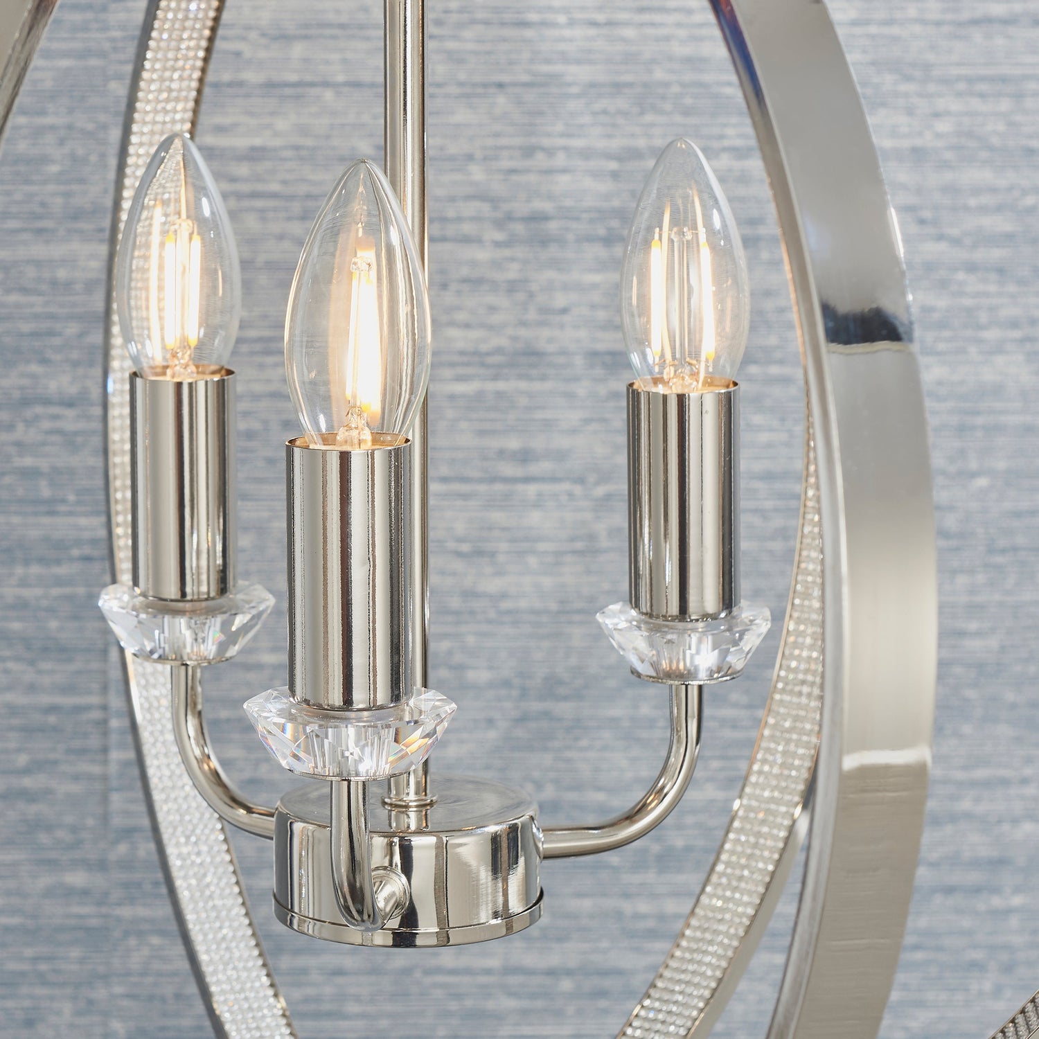 This timeless ceiling pendant combines highly polished bright nickel metalwork encrusted with thousands of clear faceted reflective details with a modern open frame design. Perfect when paired with the latest LED filament lamps. Suspended from height adjustable chain with clear flex.