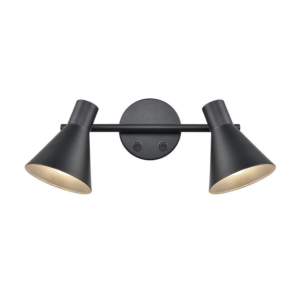 A dual lamp, wall-fitted spotlight in matt black. A silver finish on the inside of the shade enhances the illumination and offers a bright glow. There two rocker switches situated low on the face of the fitting plate. The spotlights have full range of motion and can be positioned by hand.