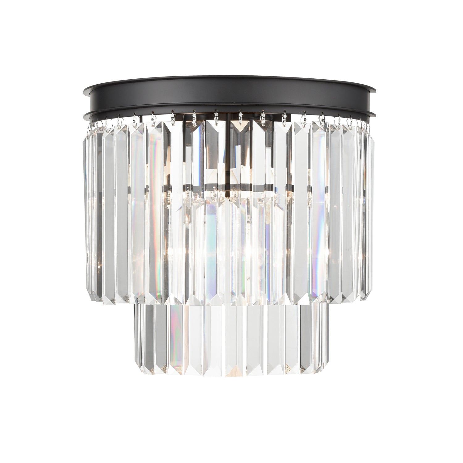 Finished Matt Black with a semi-circle of crystal drops each side of the wall light. This classic wall fitting would suit a lounge or living space. Also available as a pendant and in a black finish.