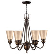 Mayflower 6lt chandelier offers a bold traditional design in a lustrous Olde Bronze finish with inside etched amber glass. The unique yoke-mount glass holders and decorative cast tension knob detailing add authentic flair.