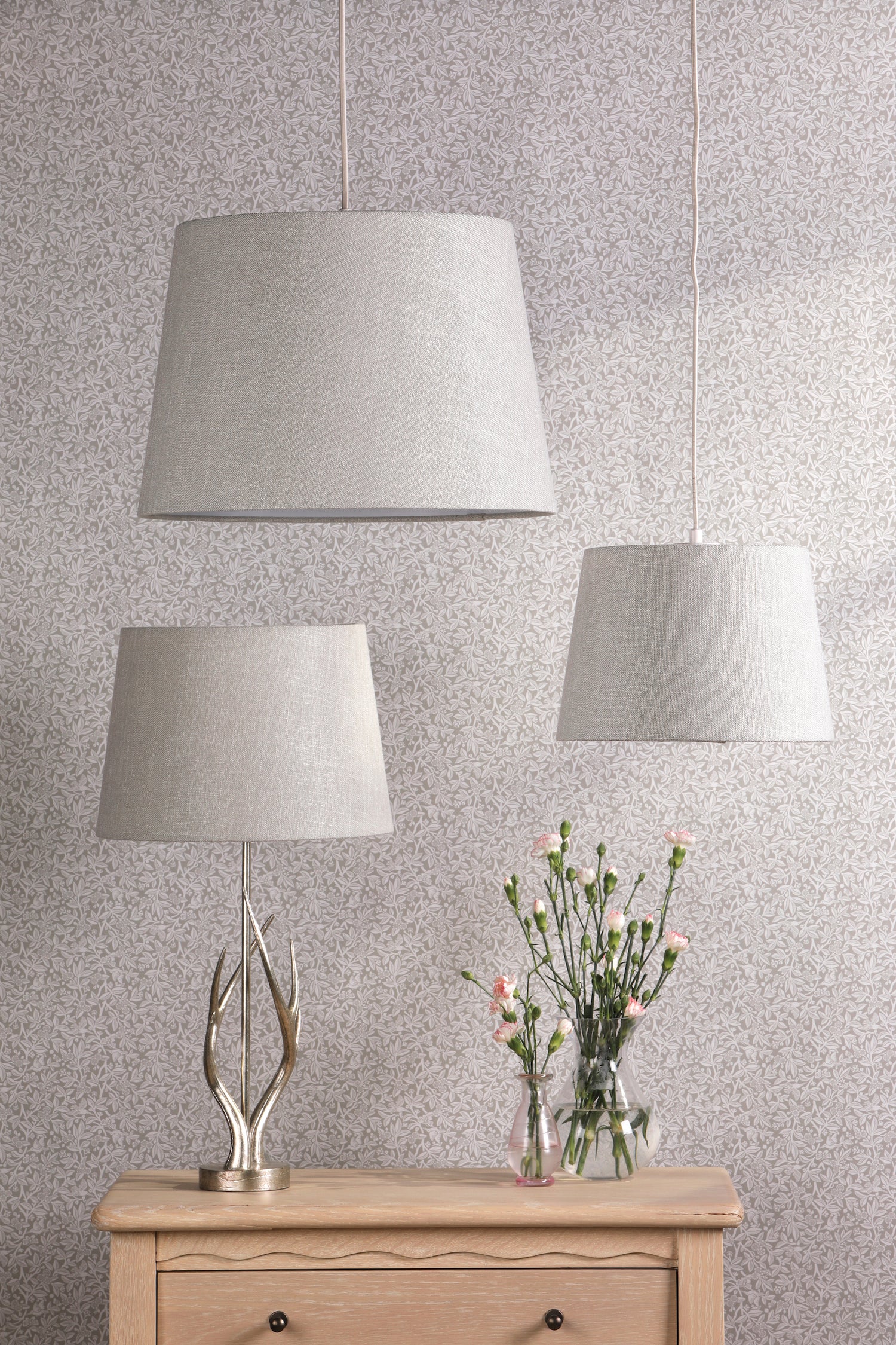 Crafted by Laura Ashley with attention to classic detailing, the Bacall shade showcases elegant design with oatmeal hue and tapered empire silhouette. Easy-Fit shade with universal shade ring and reversible gimbal for table lamps, floor lamps, and ceiling fittings. Dimmable when paired with suitable bulbs. Requires 1 x E27 bulb (not included, max 60W, LED E27 recommended).