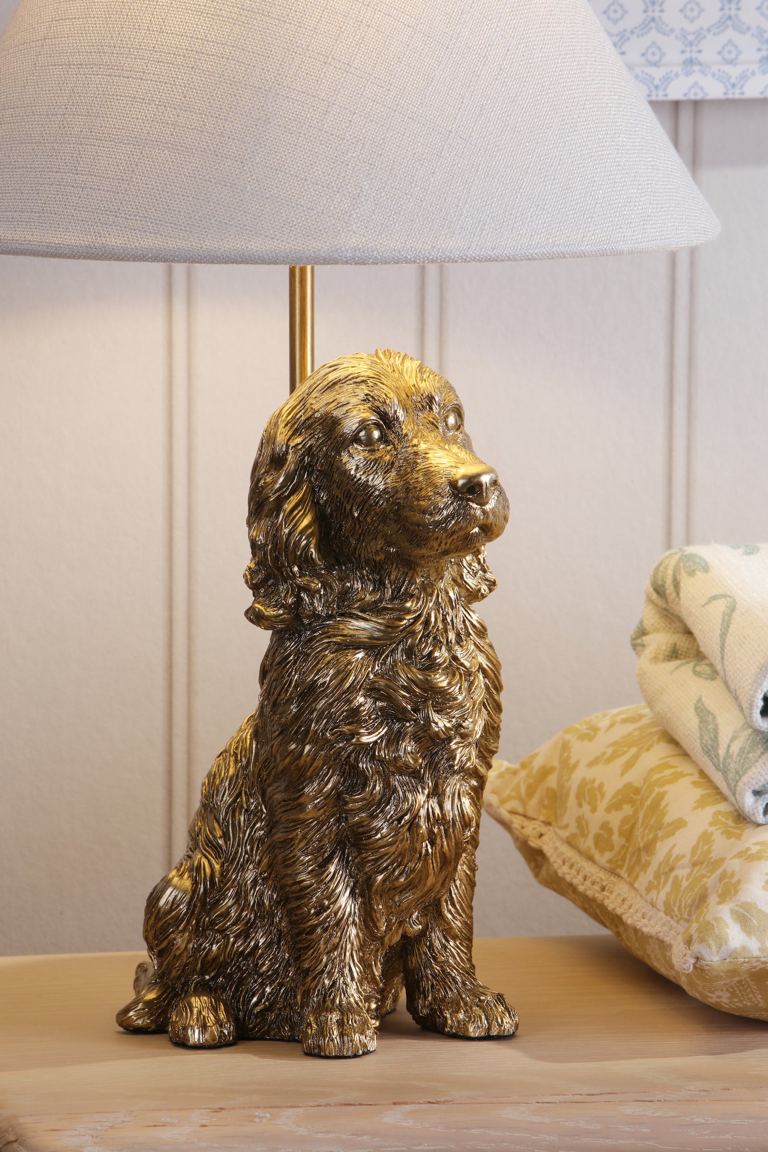 The Cocker Spaniel lamp excels in living rooms where antique gold adds whimsical charm on side tables, in bedrooms where playful design creates cosy atmosphere, or on console tables where unique silhouette provides conversation-starting focal point. The gold and linen combination works beautifully in traditional interiors, contemporary homes, elegant living rooms, and spaces seeking versatile table lamps with signature style and delightful character.