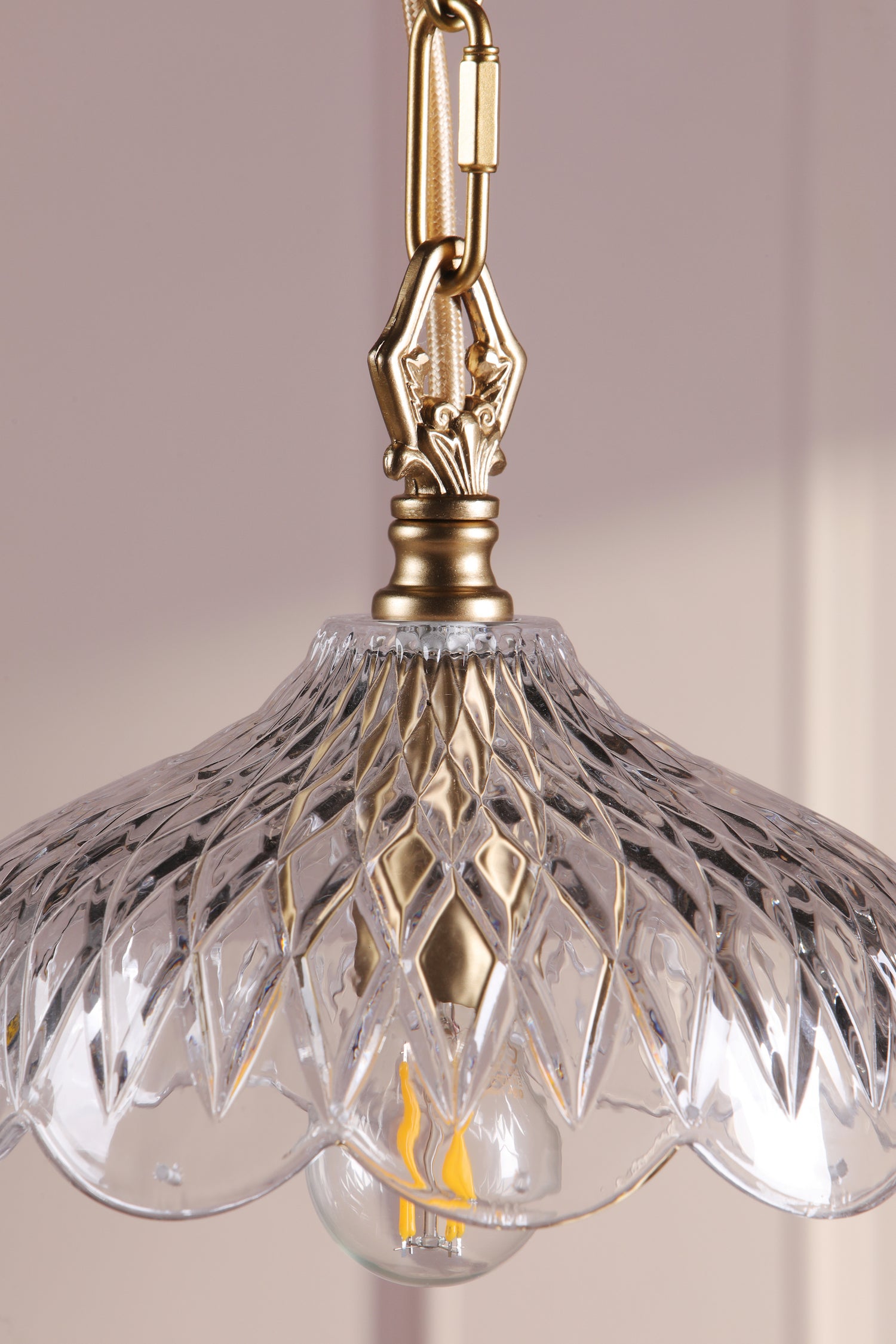 - Cut glass crystal detailing – Intricate design catches and refracts light for warm, shimmering effect