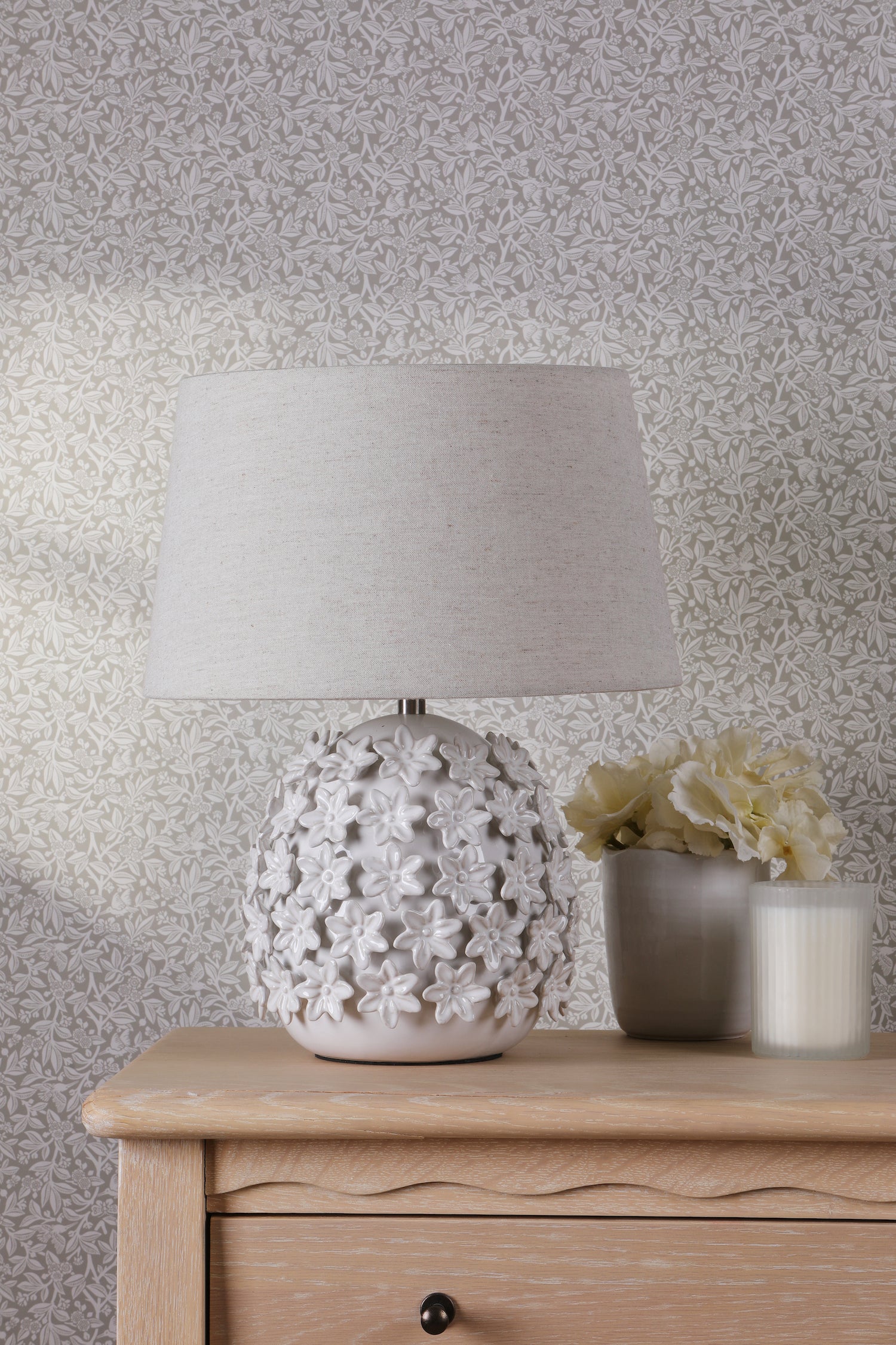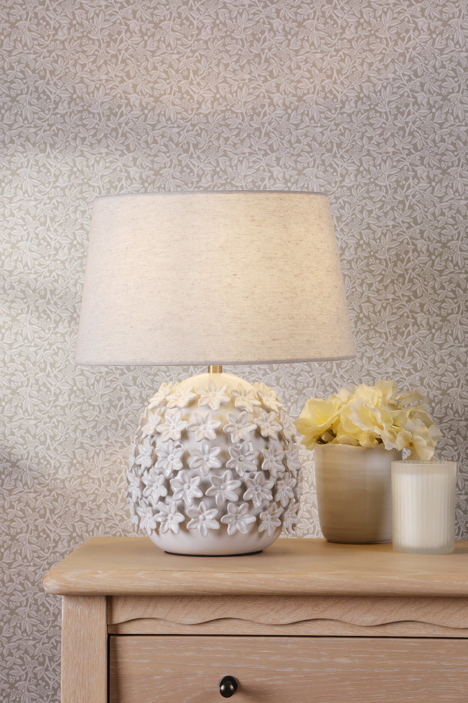Crafted by Laura Ashley with attention to romantic detailing, the Ingham lamp showcases charming design with off-white ceramic base featuring signature romantic floral design, brushed silver metalwork, and natural linen tapered drum shade. Laura Ashley's expertise shines through in intricate details and quality craftsmanship. Complete with shade for immediate use. Requires 1 x E14 bulb (not included, max 60W, LED E14 3w recommended).