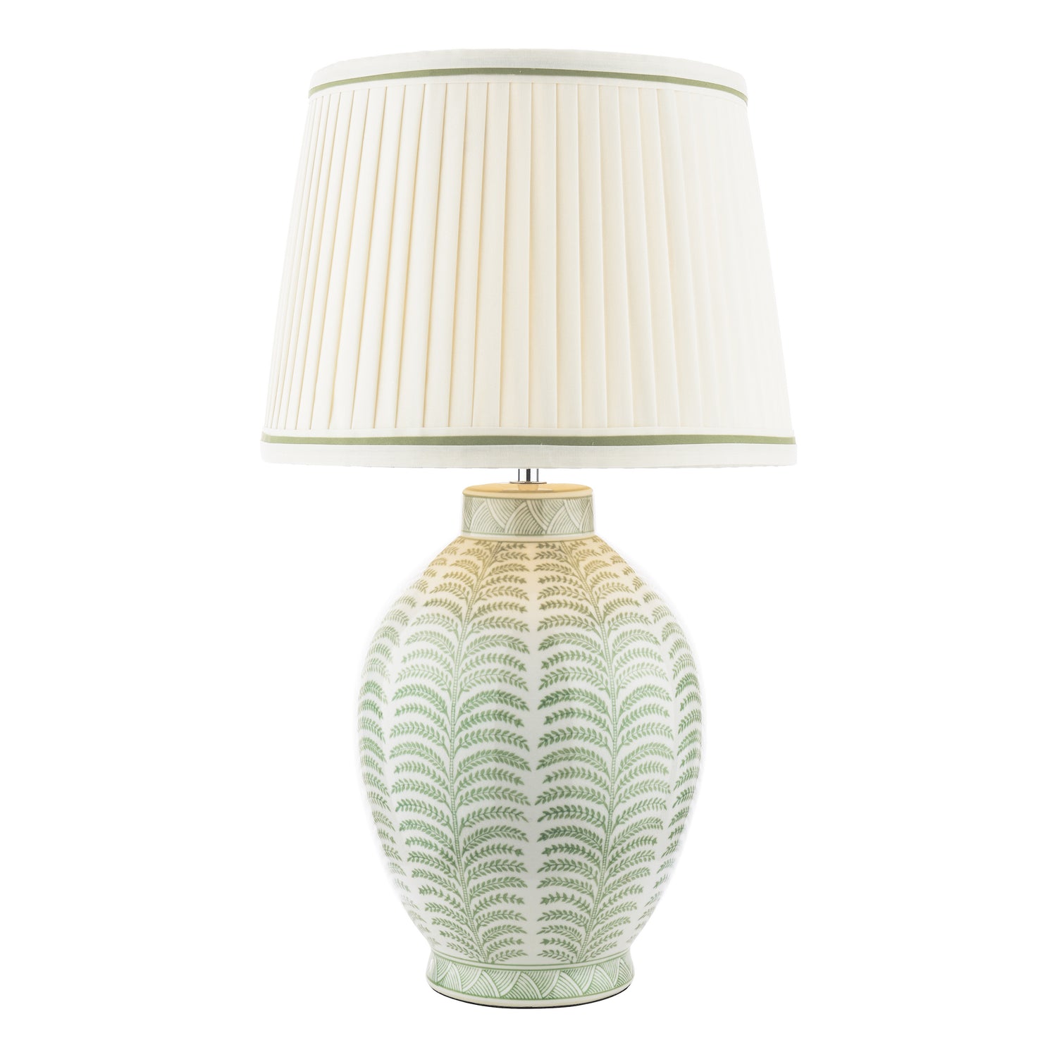 The Laura Ashley Stannard table lamp brings sophisticated style with its eye-catching green ceramic base paired with polished chrome detailing and large pleated shade with coloured trim. Featuring timeless shape with elegant design, this gorgeous lamp creates warm, inviting illumination perfect for living rooms, bedrooms, and beside tables, combining tasteful statement styling with functional lighting that enhances décor in contemporary and traditional interiors.