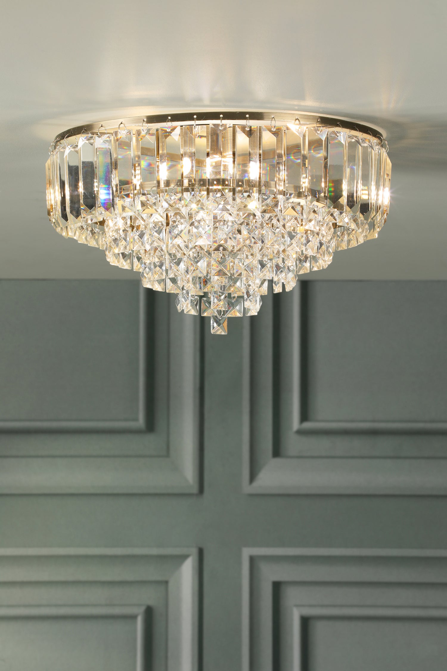 Crafted by Laura Ashley with attention to classic detailing, the Vienna flush showcases timeless design with antique brass circular frame and stunning bevelled glass coffin crystal rods with glittering fountain of square-cut faceted glass droplets. The flush profile allows the light's glamorous crystal detailing to shine while the three soft light sources combine to cast warm, sparkling glow. Perfect for spaces with lower ceiling heights. Requires 3 x G9 bulbs (not included, max 20W each, LED G9 6w recommended).