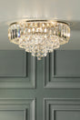 The Laura Ashley Vienna 3-light flush ceiling light brings glamorous elegance with its sophisticated antique brass finish paired with stunning bevelled glass coffin crystal rods and glittering fountain of square-cut faceted glass droplets. Featuring classic styling with luxurious crystal detailing, this elegant three-light flush creates warm, sparkling illumination perfect for bedrooms, hallways, and low-ceiling spaces, combining old-world glamour with functional lighting that adds refined character and welcoming atmosphere to traditional and contemporary interiors.