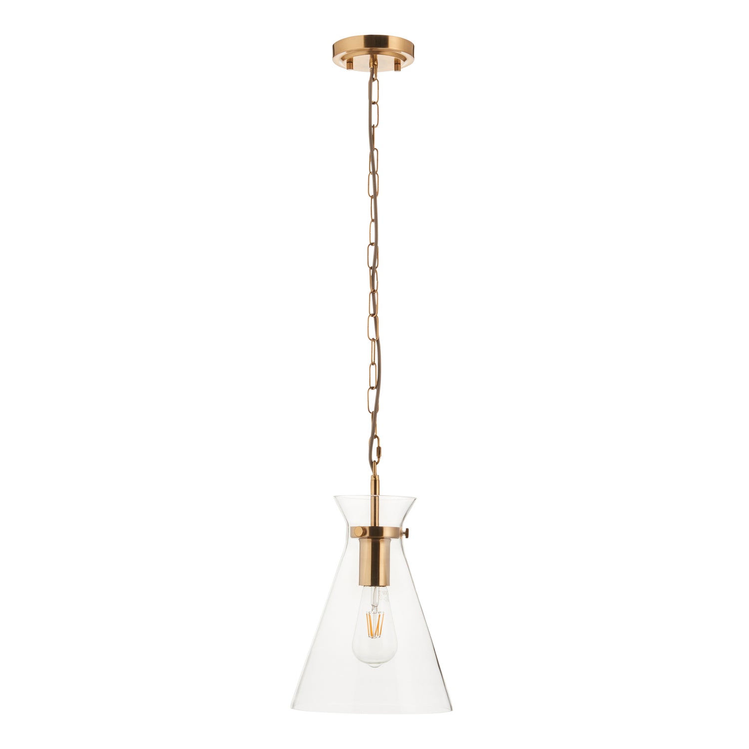 This stylish pendant combines a brushed aged brass effect plate with a clear glass shade for a warm, contemporary look. Fully height adjustable, it offers flexible installation to suit a variety of spaces, from kitchens and dining areas to hallways and bedrooms. The exposed bulb creates a soft, inviting glow, with a matching wall light available to complete the look.