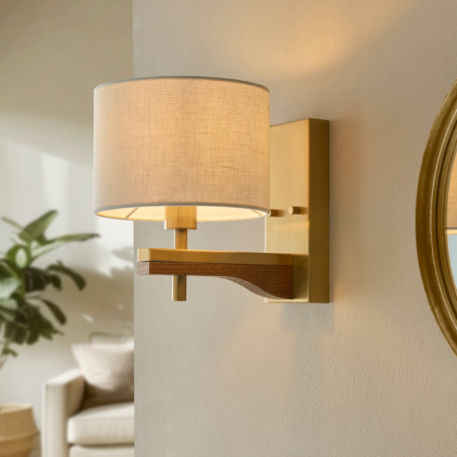 This elegant wall light features oak‑stained solid ash wood paired with brushed aged brass metalwork for a warm, refined look. Finished with natural faux‑linen shade and fully dimmable, it brings a soft, inviting glow to both modern and traditional interiors. Matching items available.