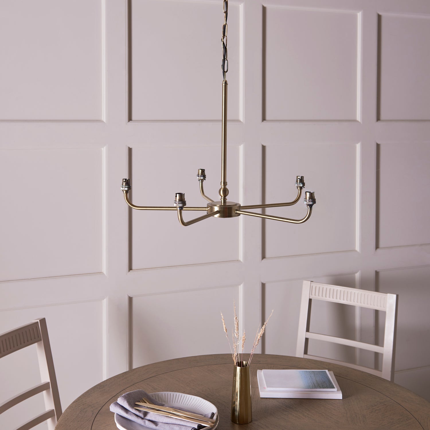This elegant 5 light pendant is finished in antique brass plate and features timeless tapered shades in natural linen fabric. Complete with B22 lamp holders for an authentic classic look. Matching items available.