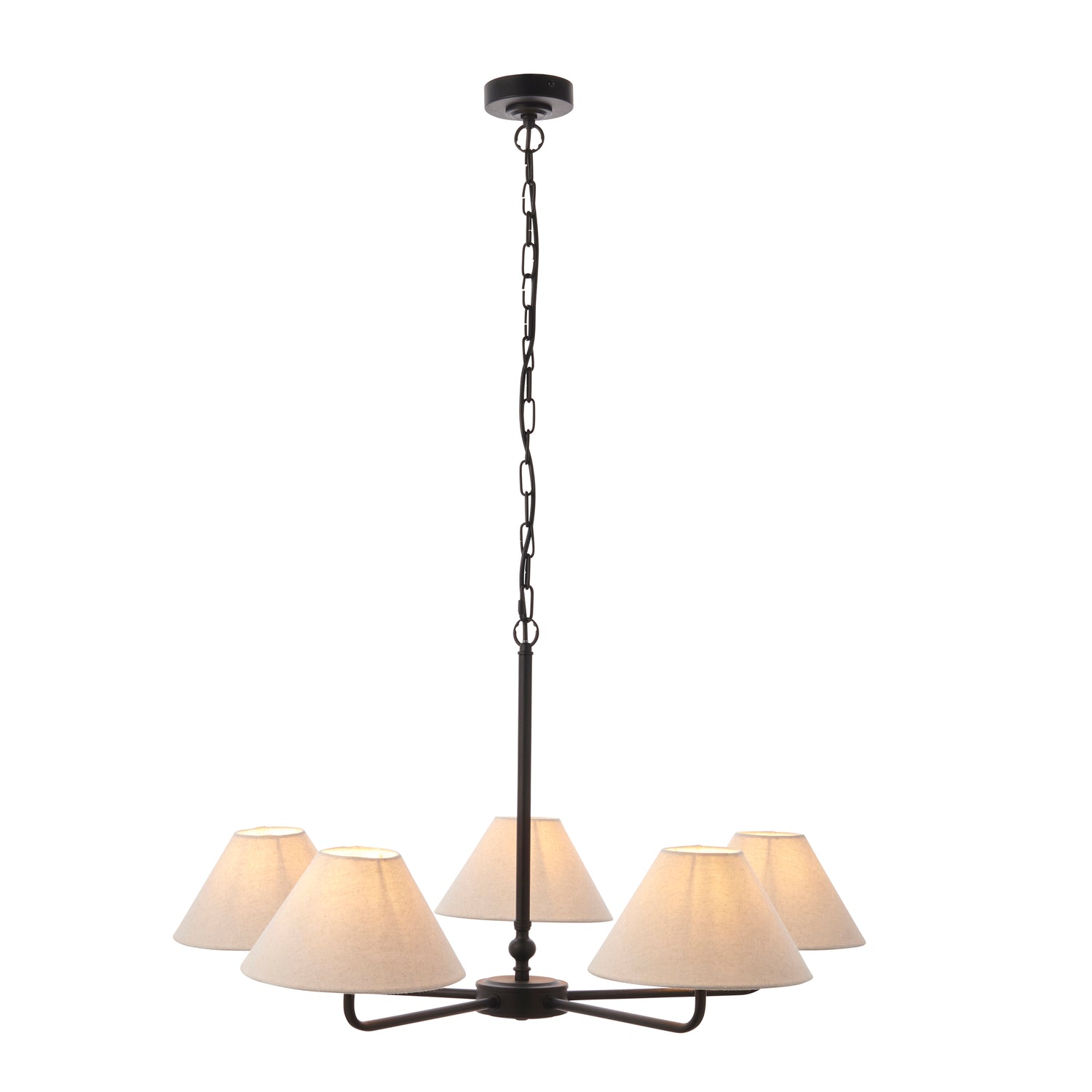 This elegant 5 light pendant is finished in matt black and features timeless tapered shades in natural linen fabric. Complete with B22 lamp holders for an authentic classic look. Matching items available.