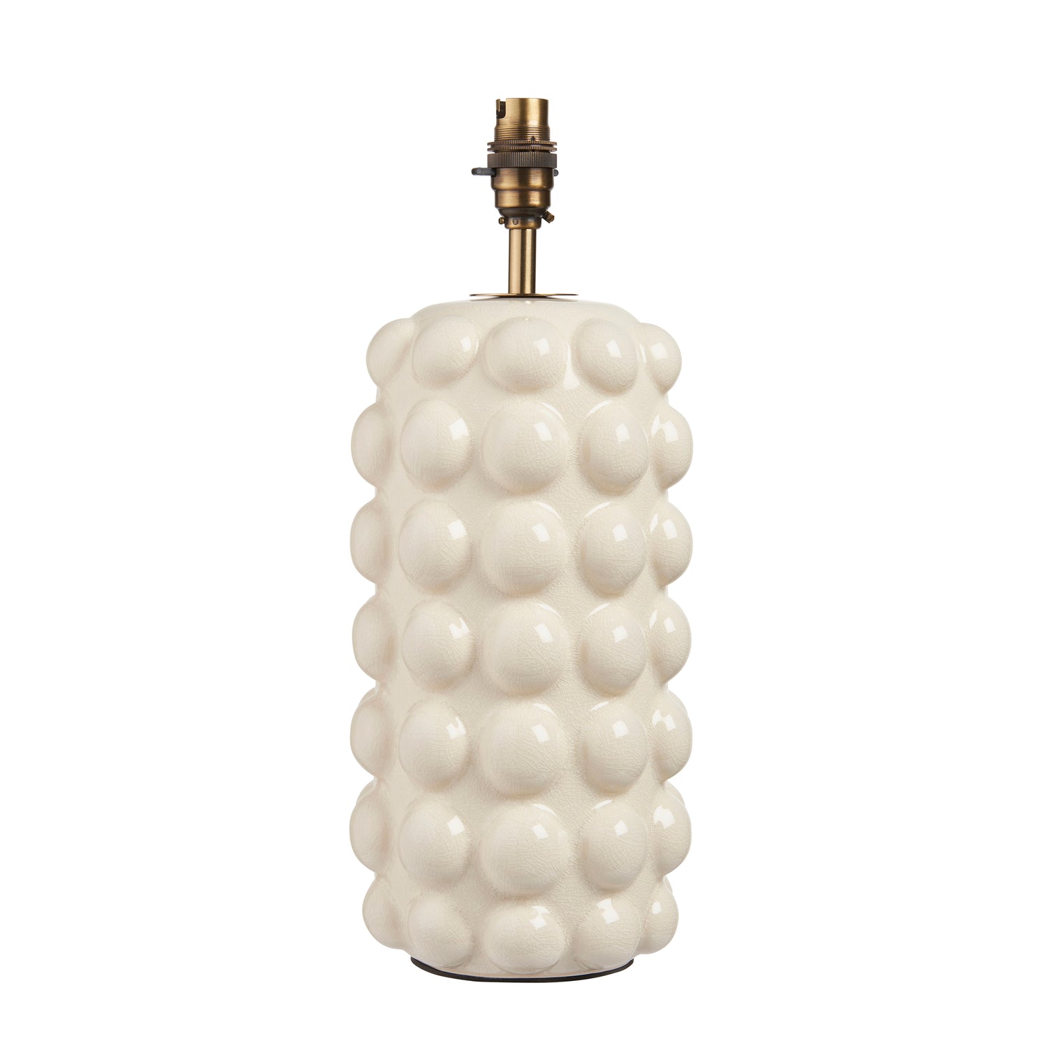 An interior must have, this playful ceramic base features sculptured bobble shapes finished in a gloss vintage white crackle glaze. With switched brass B22 lamp holder and grey braided flex, pair with one of our 35cm decorative fabric shades for the perfect interior addition.. Perfect for elevating your interiors, this piece blends timeless design with contemporary sophistication to create a stunning focal point.