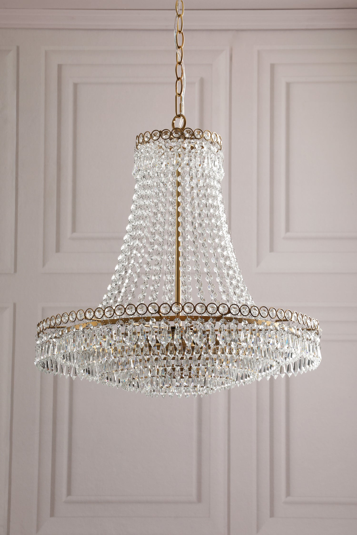 The Laura Ashley Enid 5-light grande chandelier brings classic elegance with its matt antique brass frame paired with cascade of hand-polished crystal beads. Featuring opulent French-influenced design with beautiful pendant styling, this eye-catching chandelier creates refined illumination perfect for dining rooms, living rooms, and grand spaces, combining timeless sophistication with functional lighting that adds luxurious character to traditional and contemporary interiors.