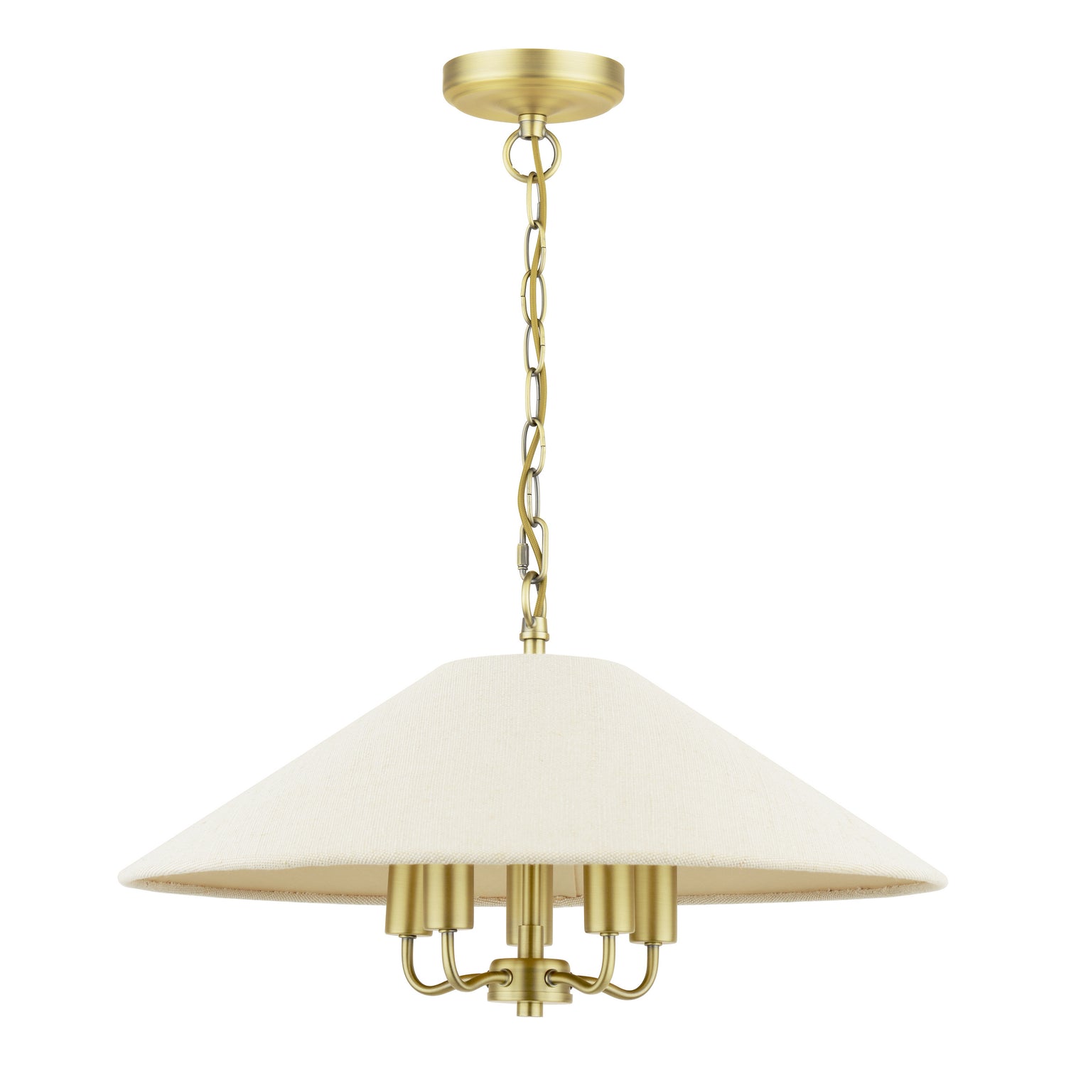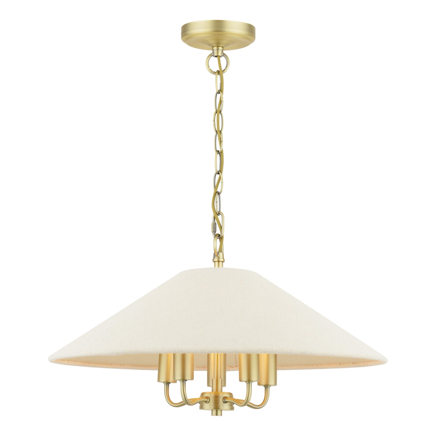 - Cream linen coolie shade – Five carefully positioned lights cast warm, inviting glow, included